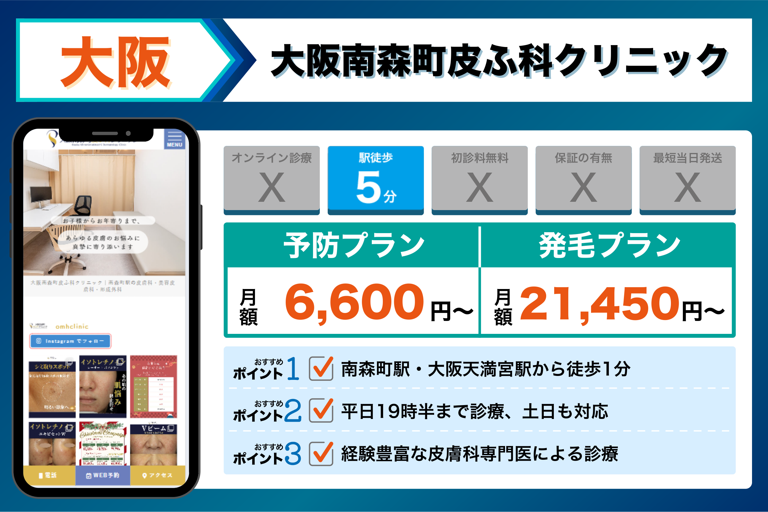 - 実際に通う利便性重視 → 大阪駅徒歩圏内の大阪梅田皮フ科スキンクリニックや、天満駅から近い和皮ふ科クリニックなど、現地の駅近クリニック