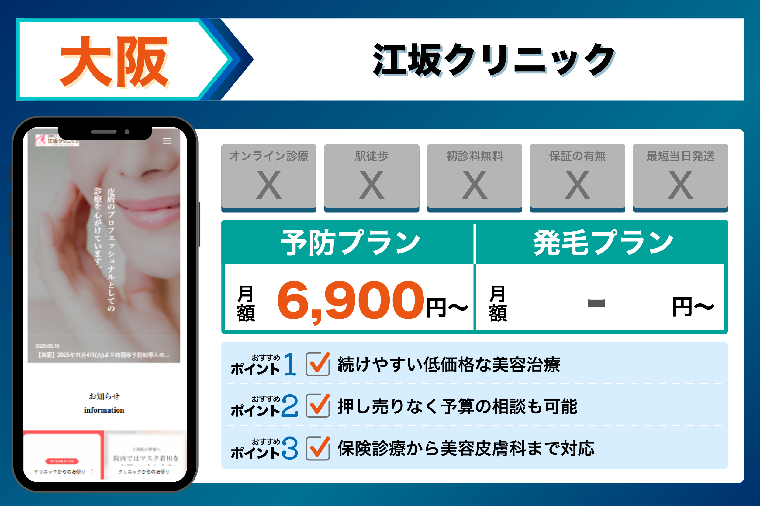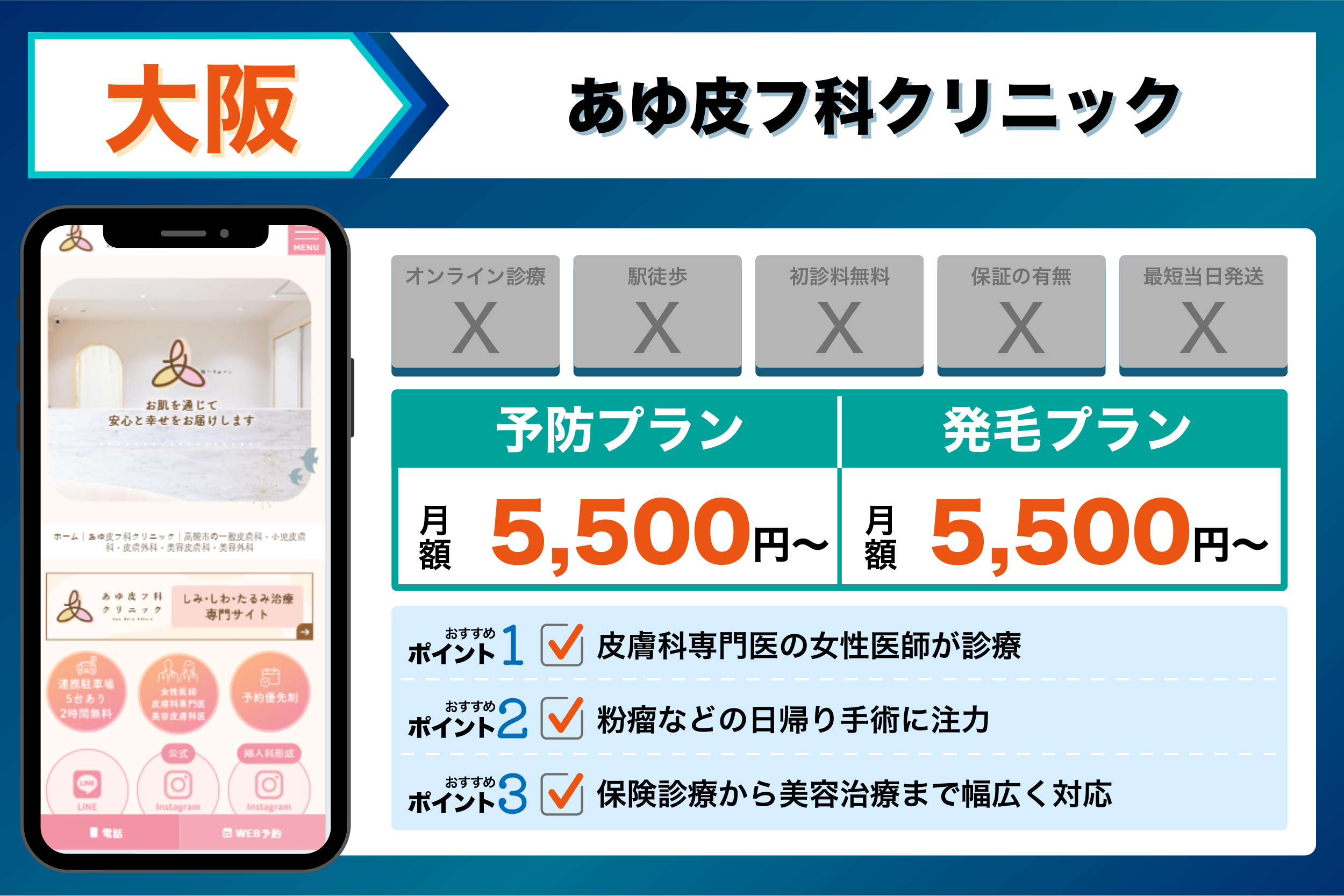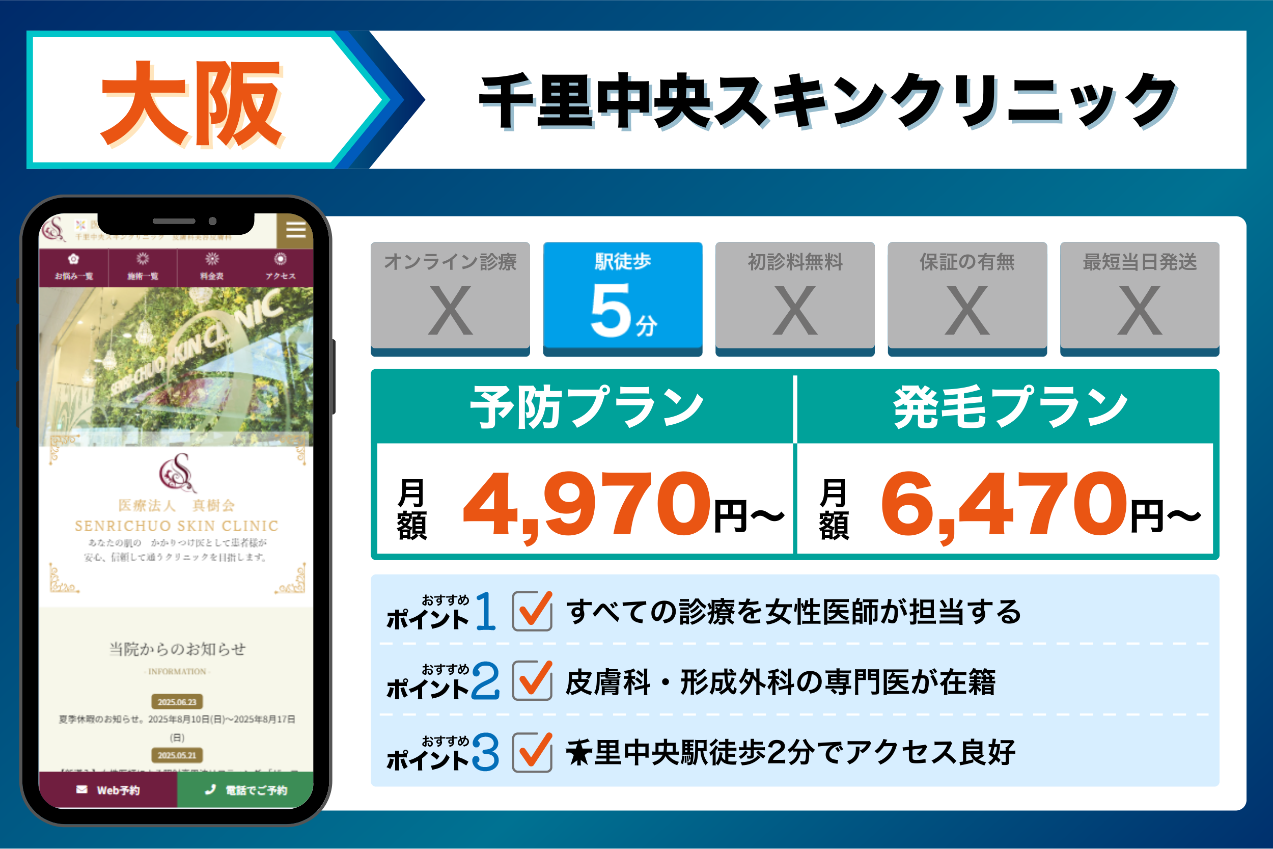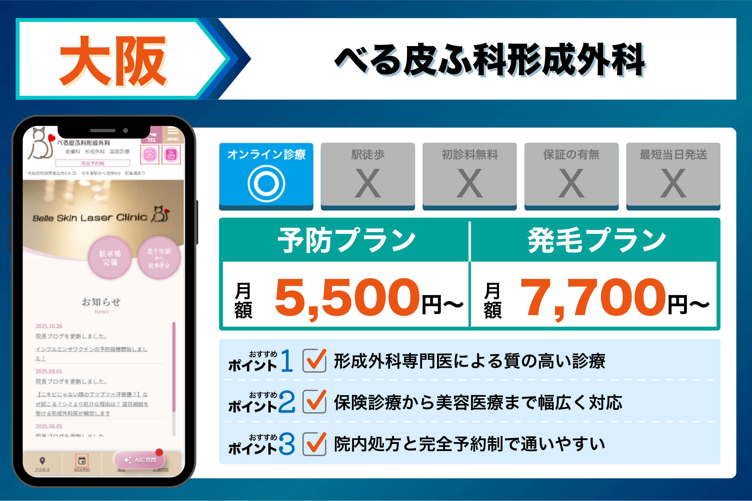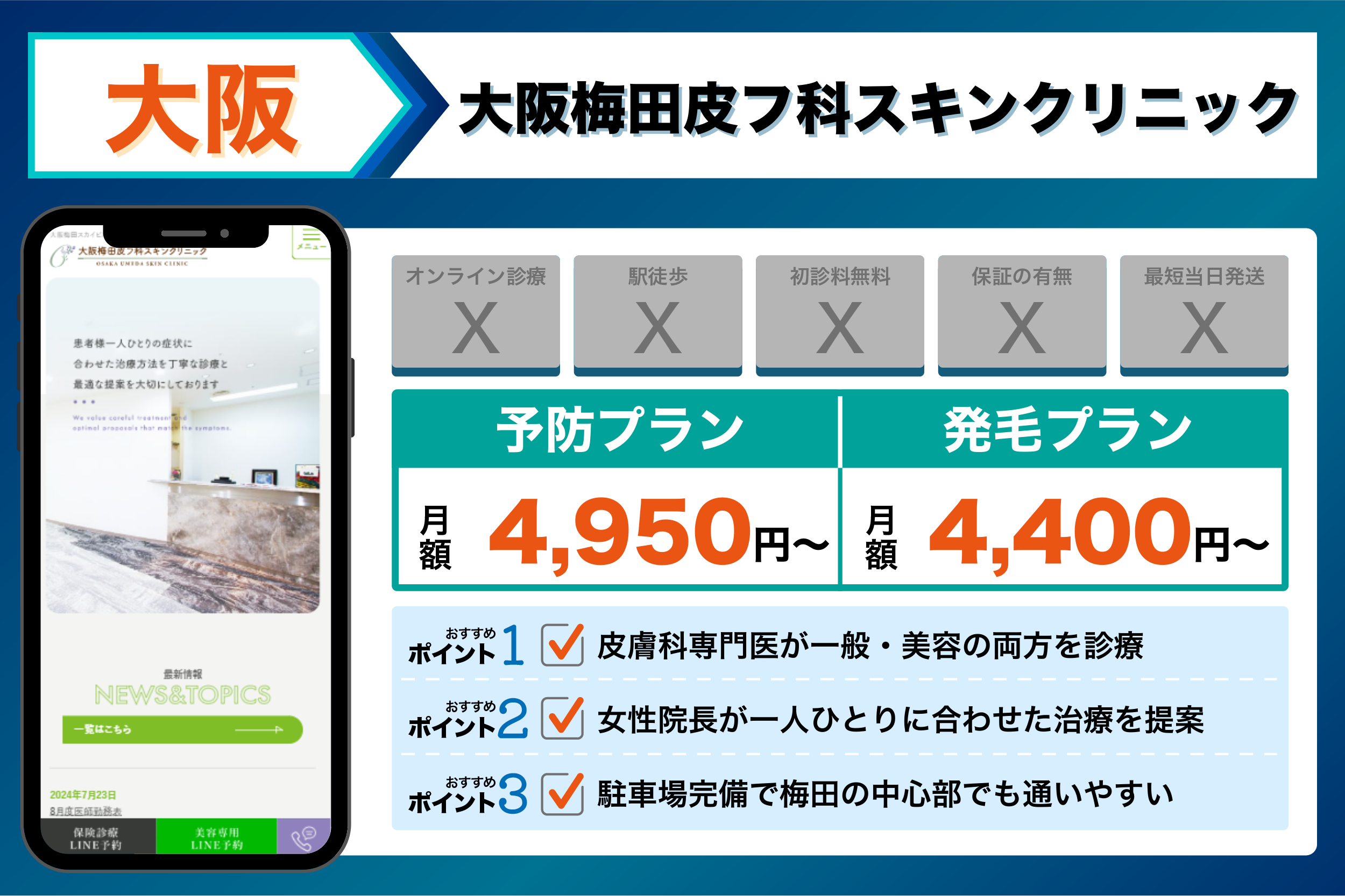 これらを踏まえて、4つの観点から選ぶ大阪でおすすめのクリニックは以下のようになりました。