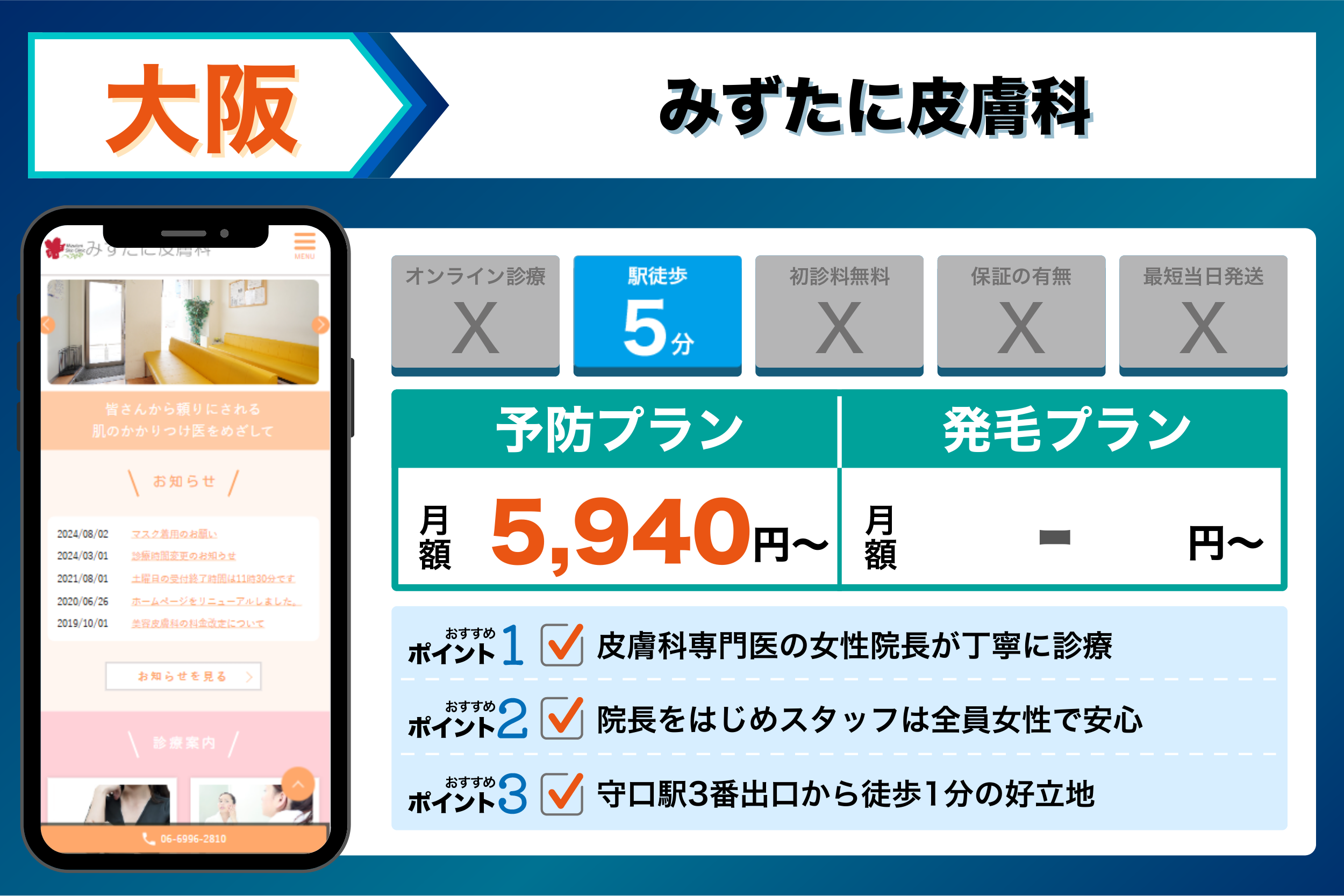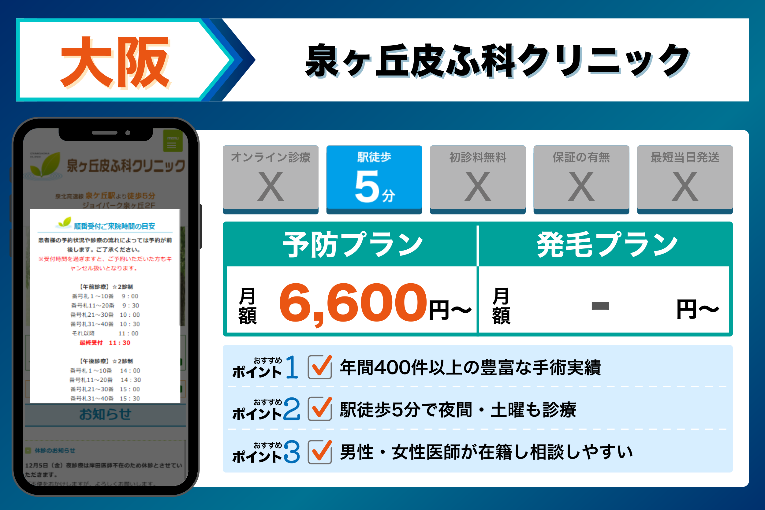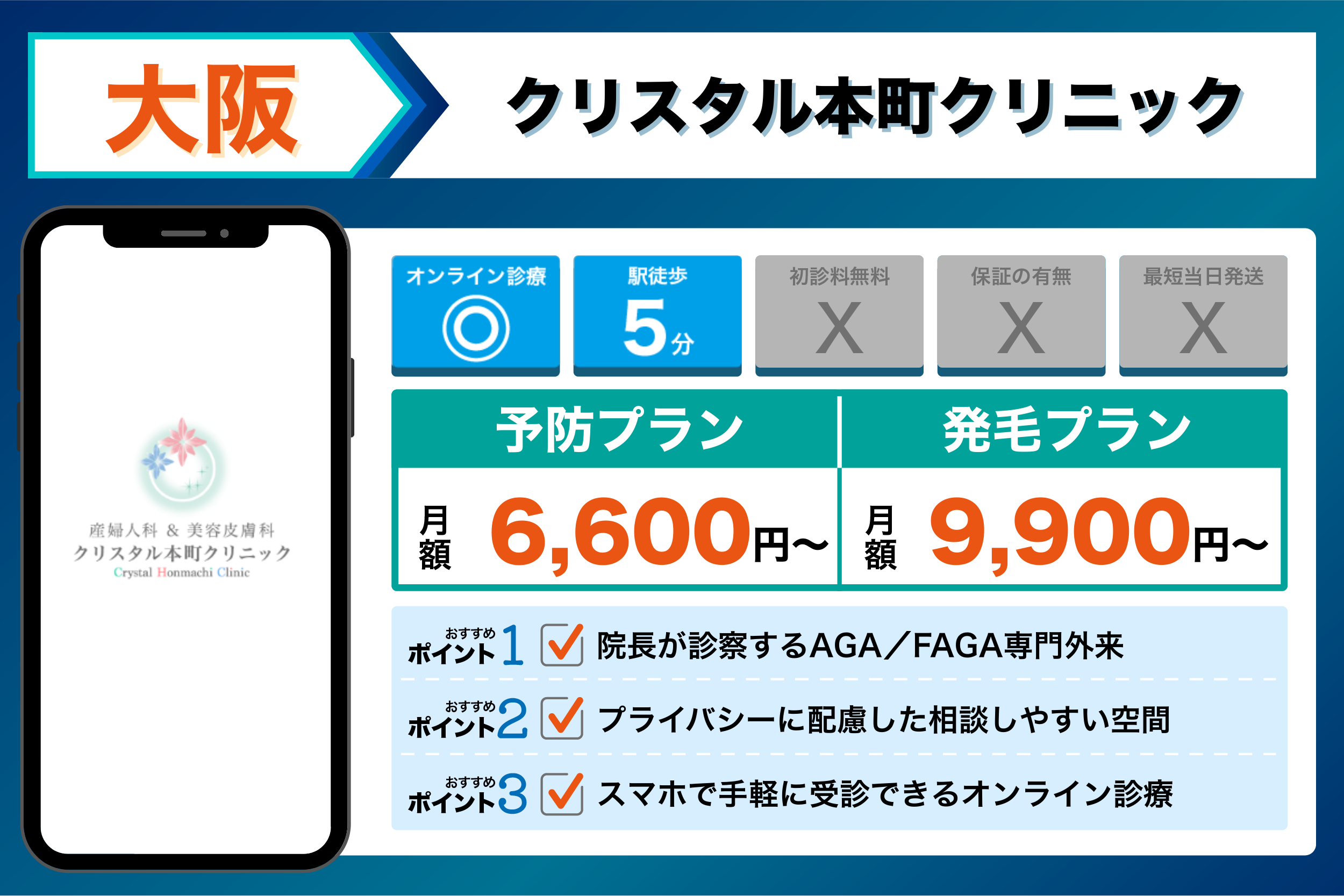 クリニック名詳細ポイント主な治療メニューオンライン診療初診料保証の有無FAGAの対応駅からのアクセス