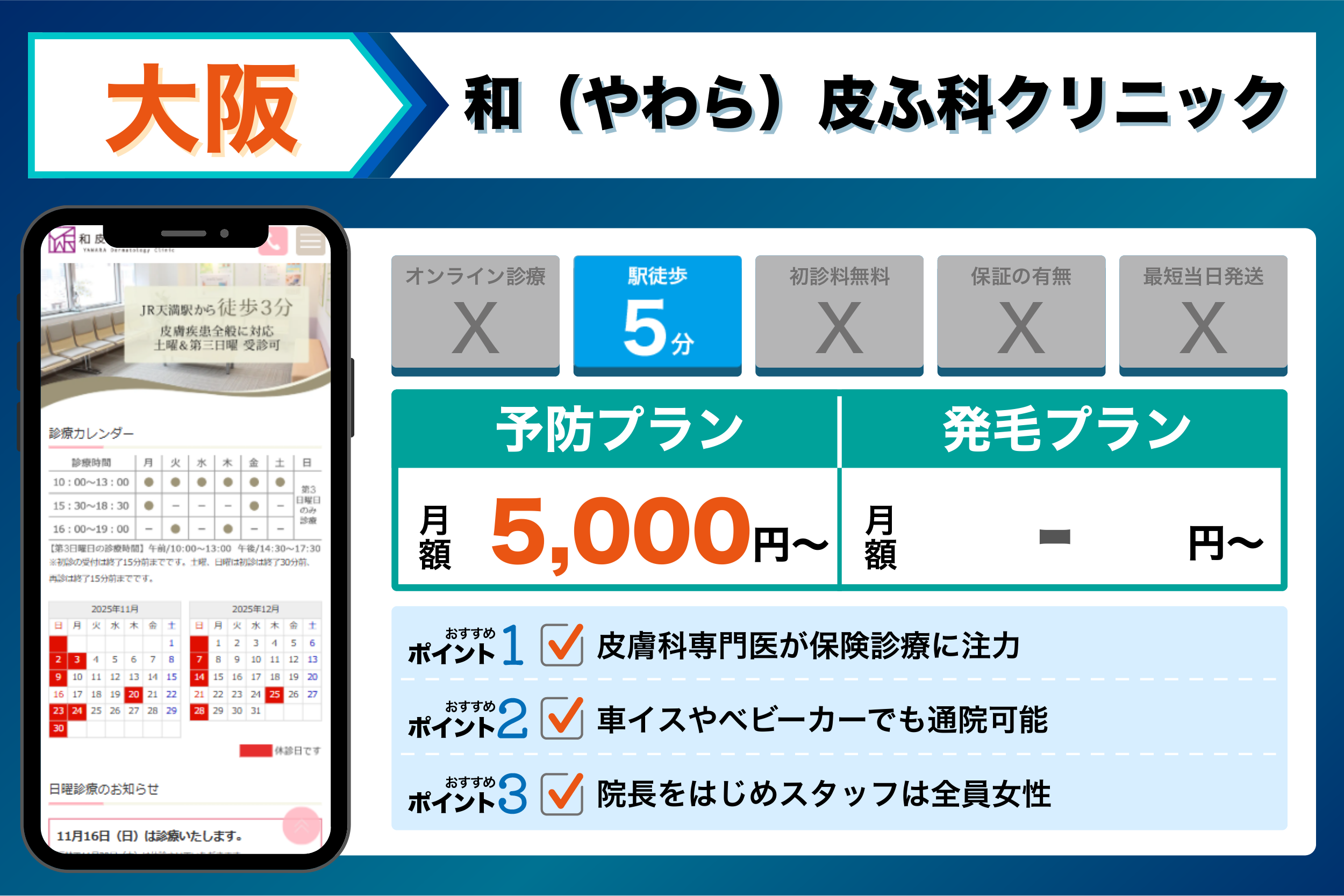 • 実際に通う利便性重視 → 大阪駅徒歩圏内の大阪梅田皮フ科スキンクリニックや、天満駅から近い和皮ふ科クリニックなど、現地の駅近クリニック