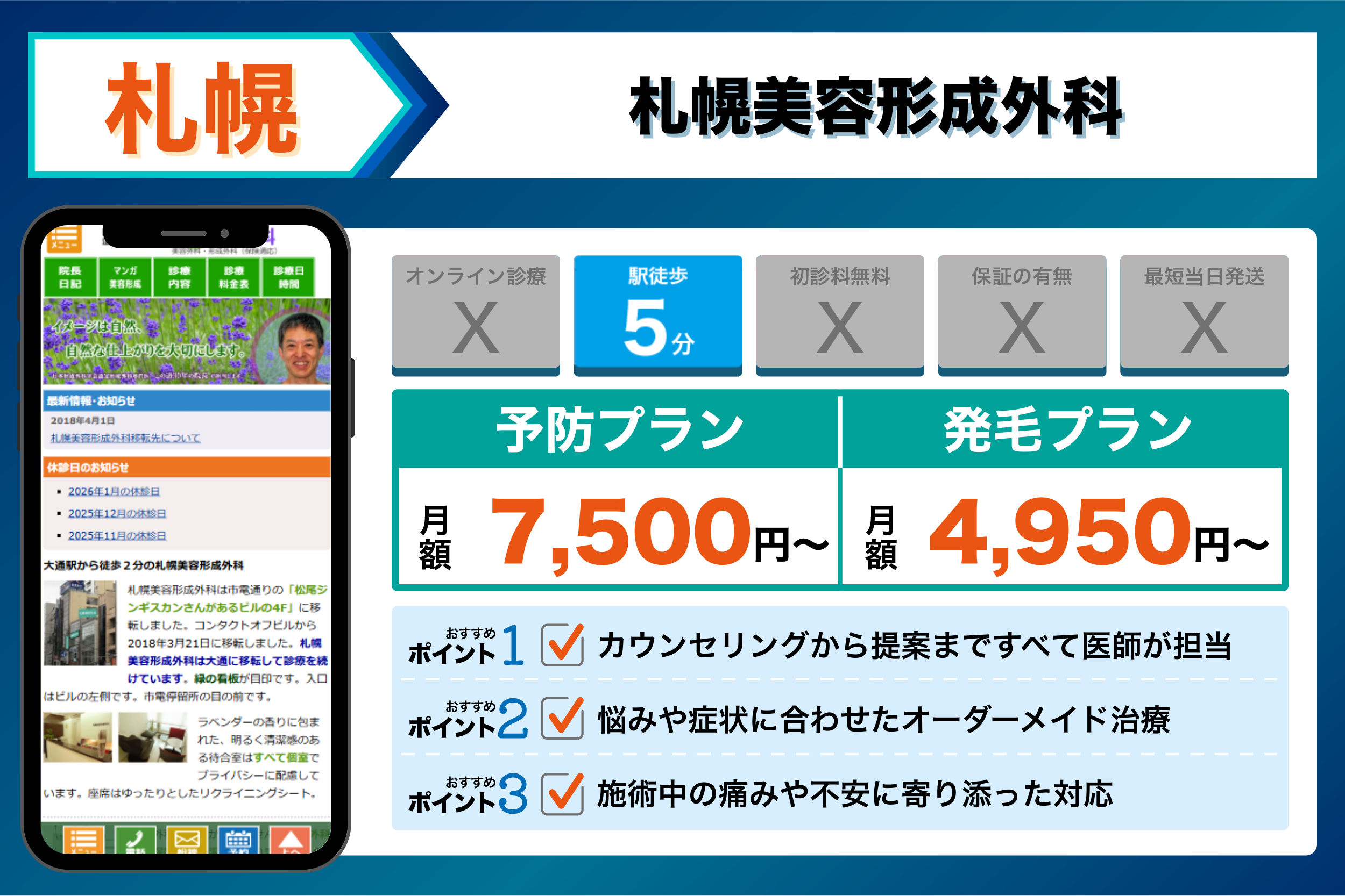 - 実際に通う利便性重視 → 札幌駅徒歩圏内の札幌中央クリニックや、大通駅から近い札幌美容形成外科など、現地の駅近クリニック
