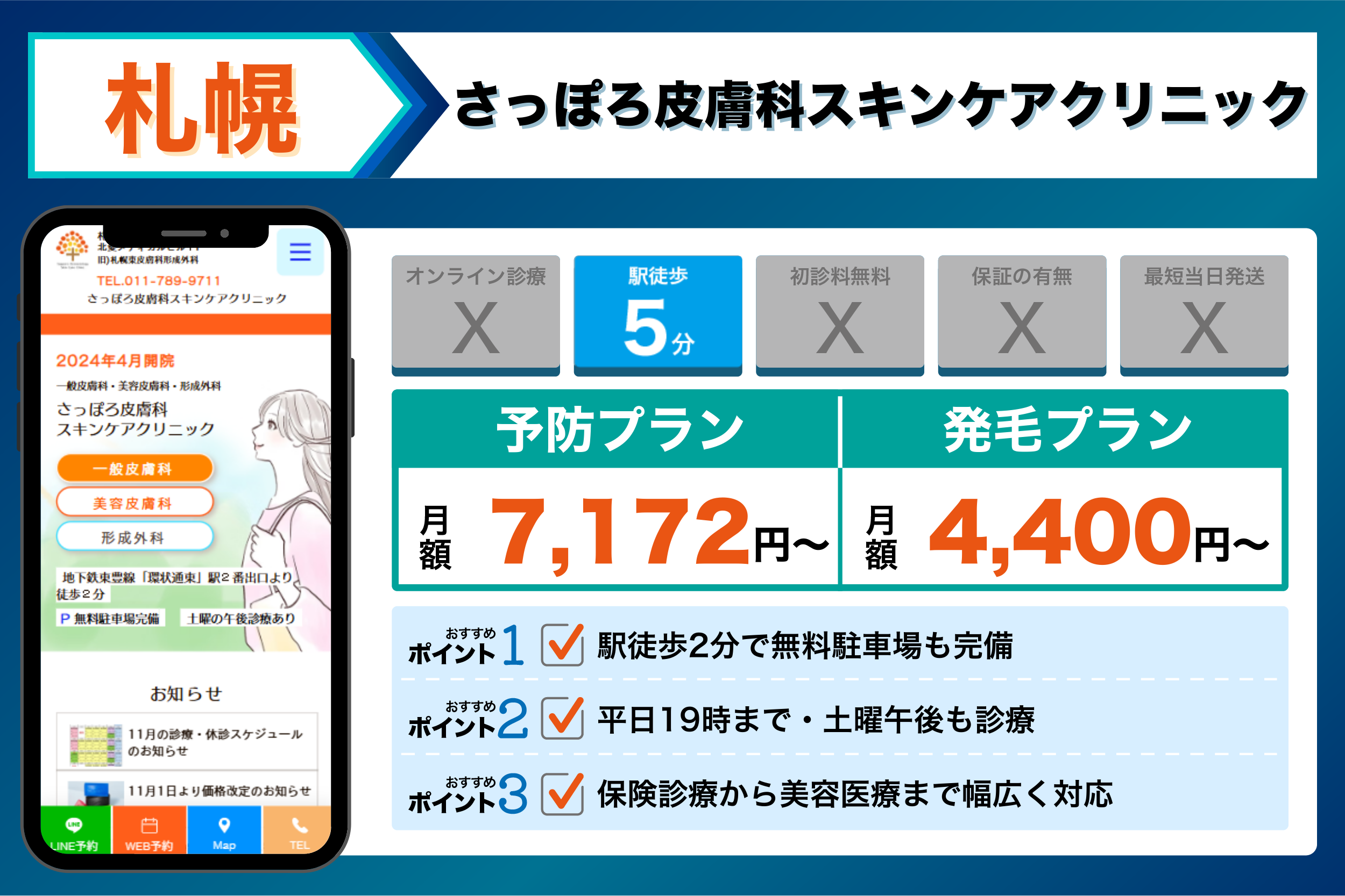さっぽろ皮膚科スキンケアクリニック | 駅徒歩2分で無料駐車場も完備 | 【発毛】:ミノキシジル配合外用液1%:4,400円(税込)から| |