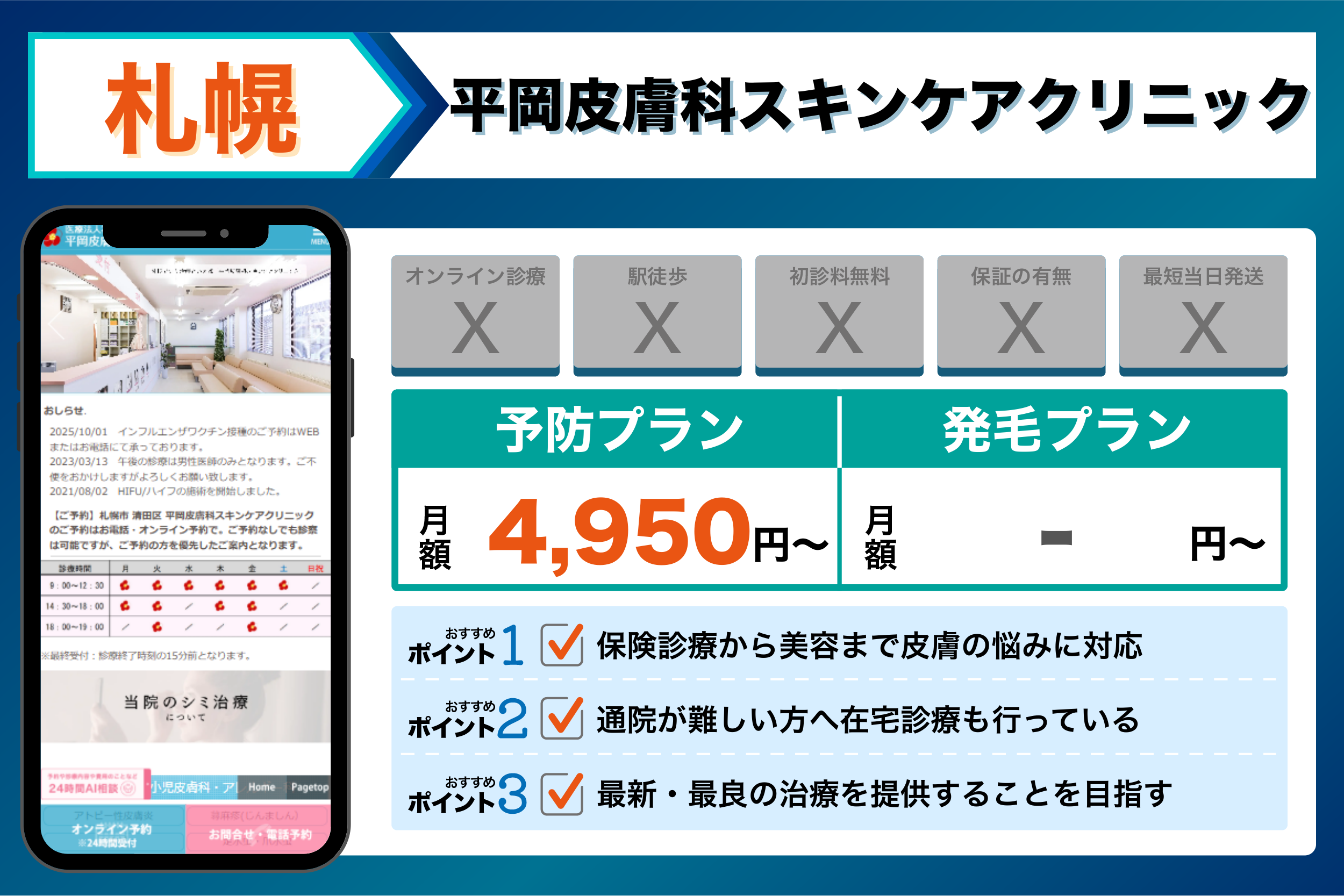 平岡皮膚科スキンケアクリニック | 保険診療から美容まで皮膚の悩みに対応 | 【予防】:フィナステリド:4,950円(税込)から |