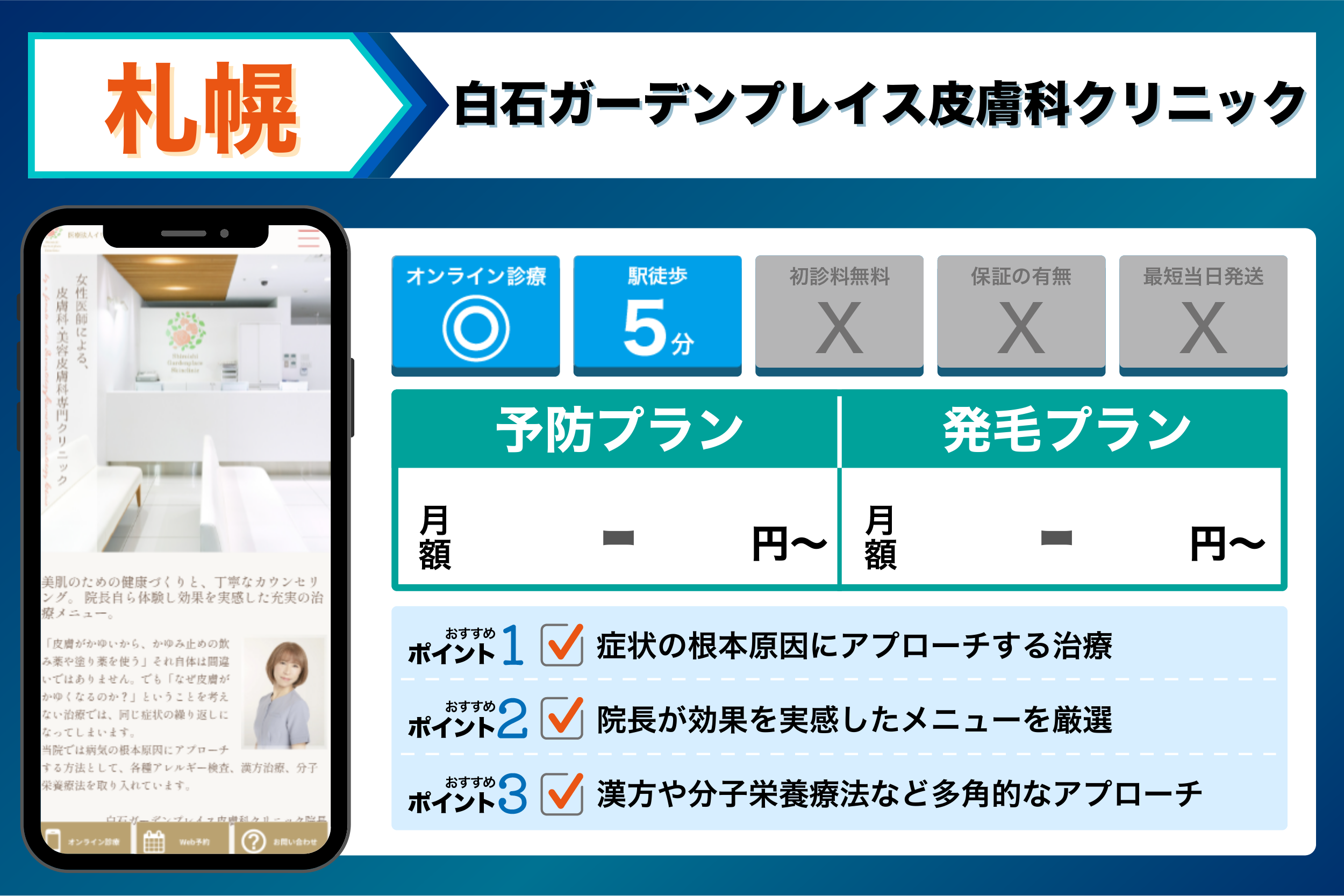 白石ガーデンプレイス皮膚科クリニック | 症状の根本原因にアプローチする治療 | 公式サイトに記載なし |