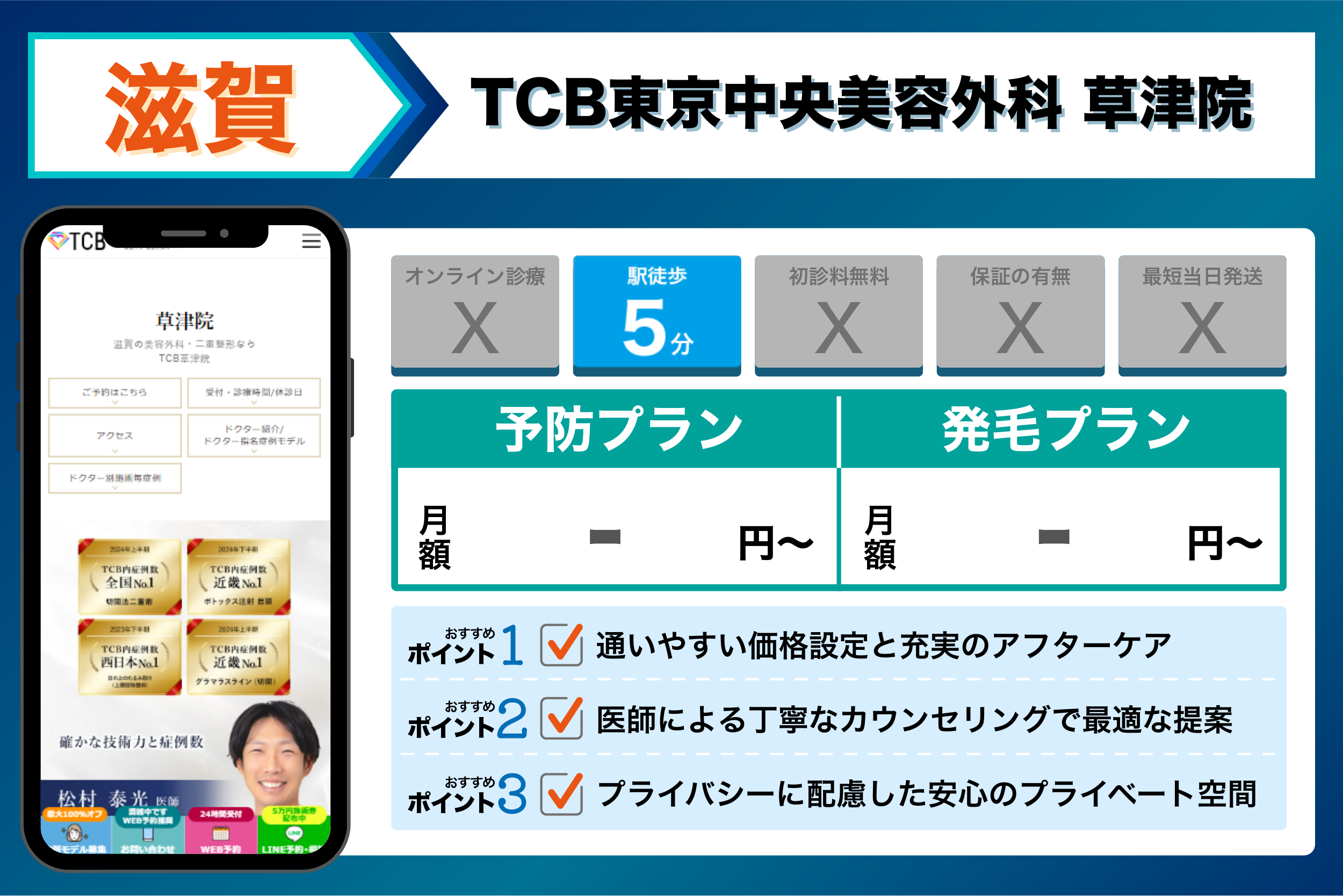 TCB東京中央美容外科 草津院 | 通いやすい価格設定と充実のアフターケア | 公式サイトに記載なし |