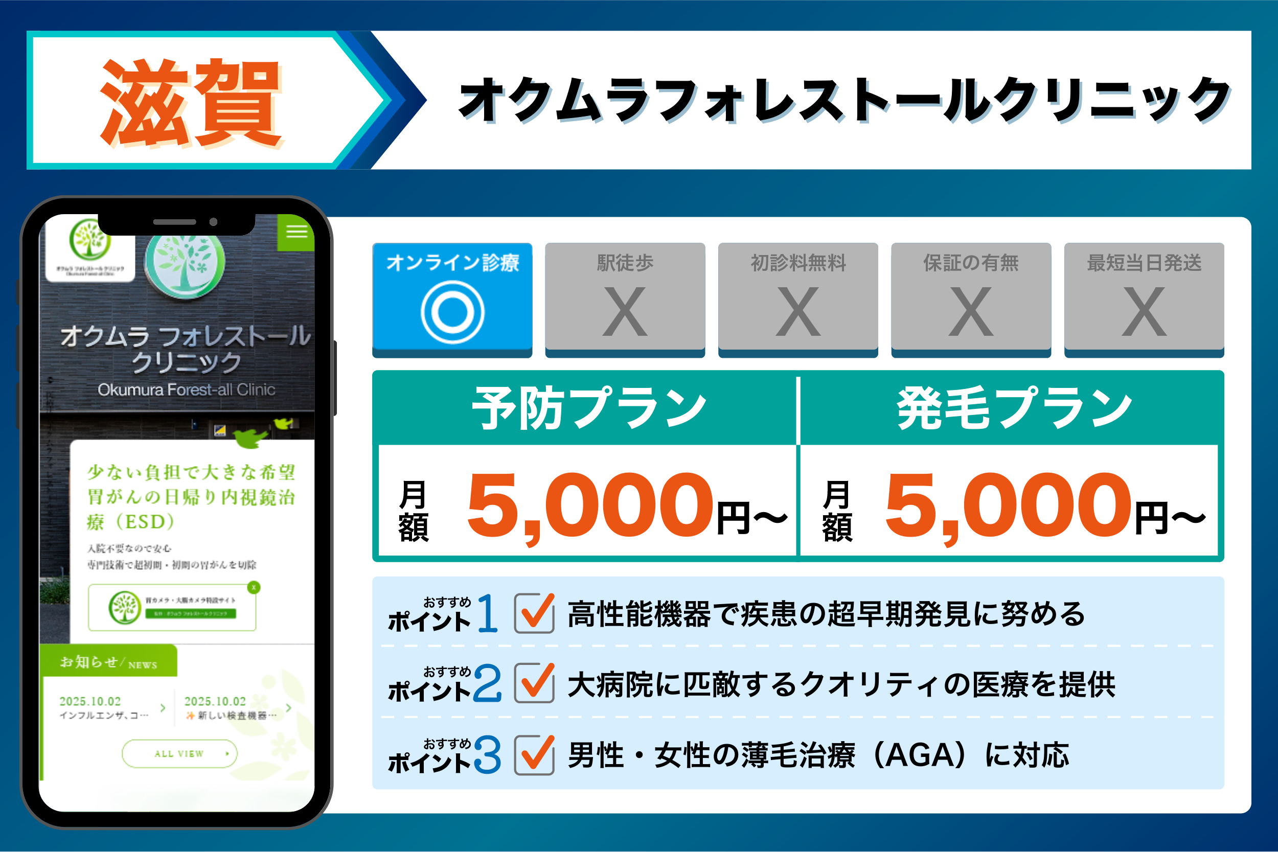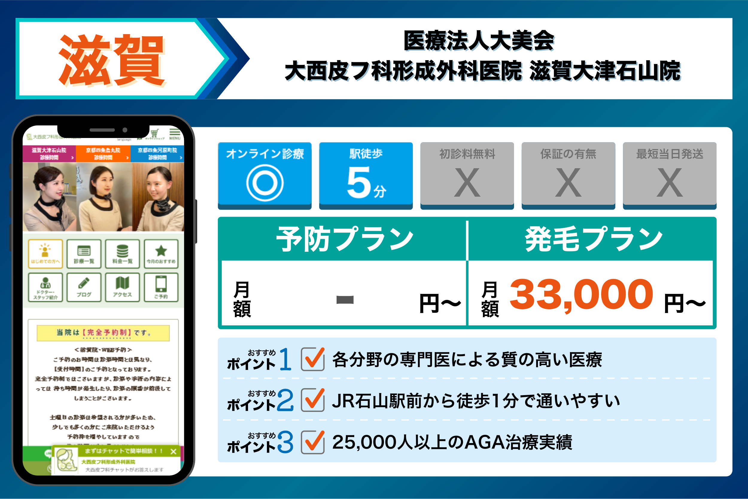 滋賀のAGAクリニックを調査してことで、AGA治療の平均相場・駅からのアクセス・初心者でも始めやすいサポート体制が整っているクリニックが明らかになりました。