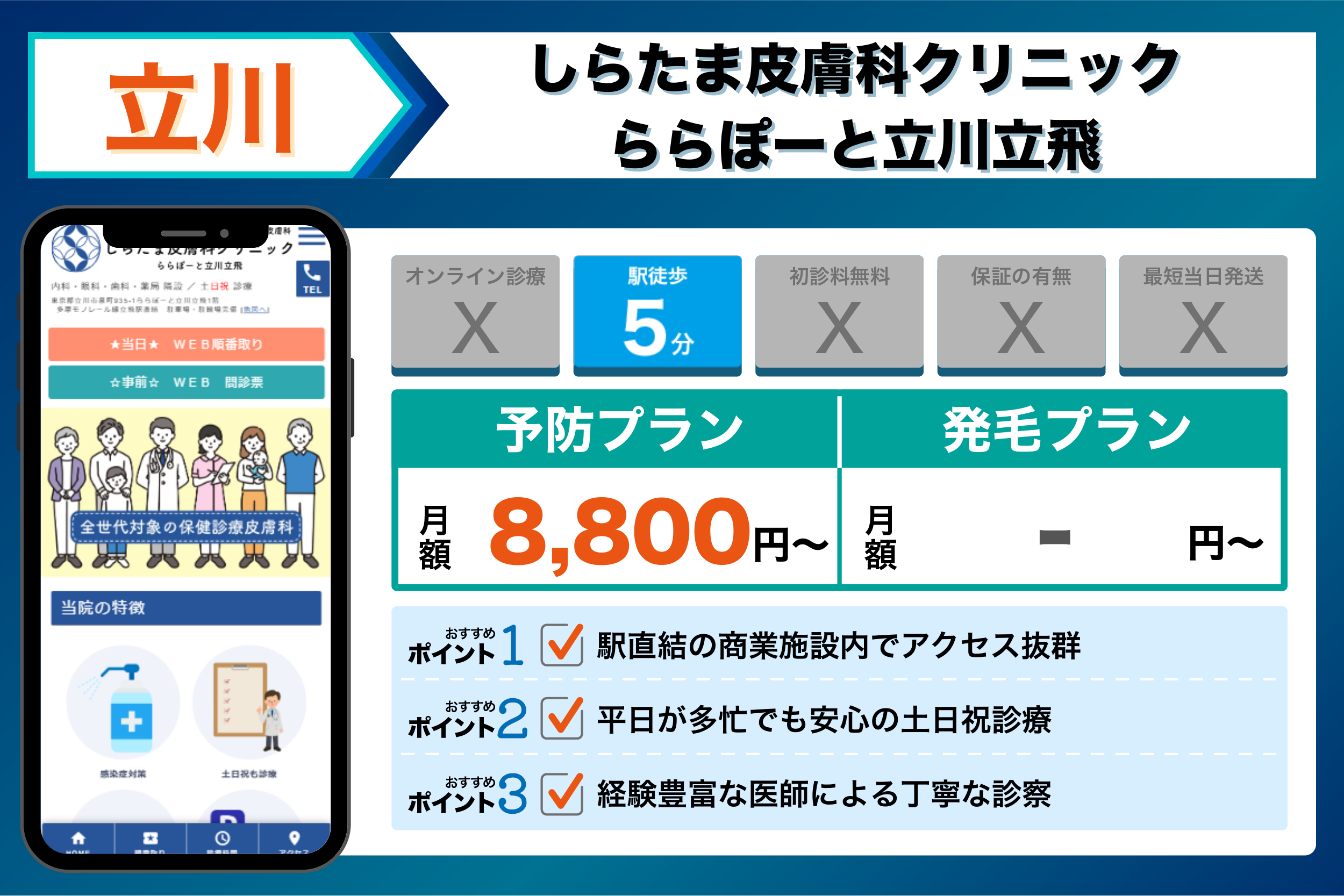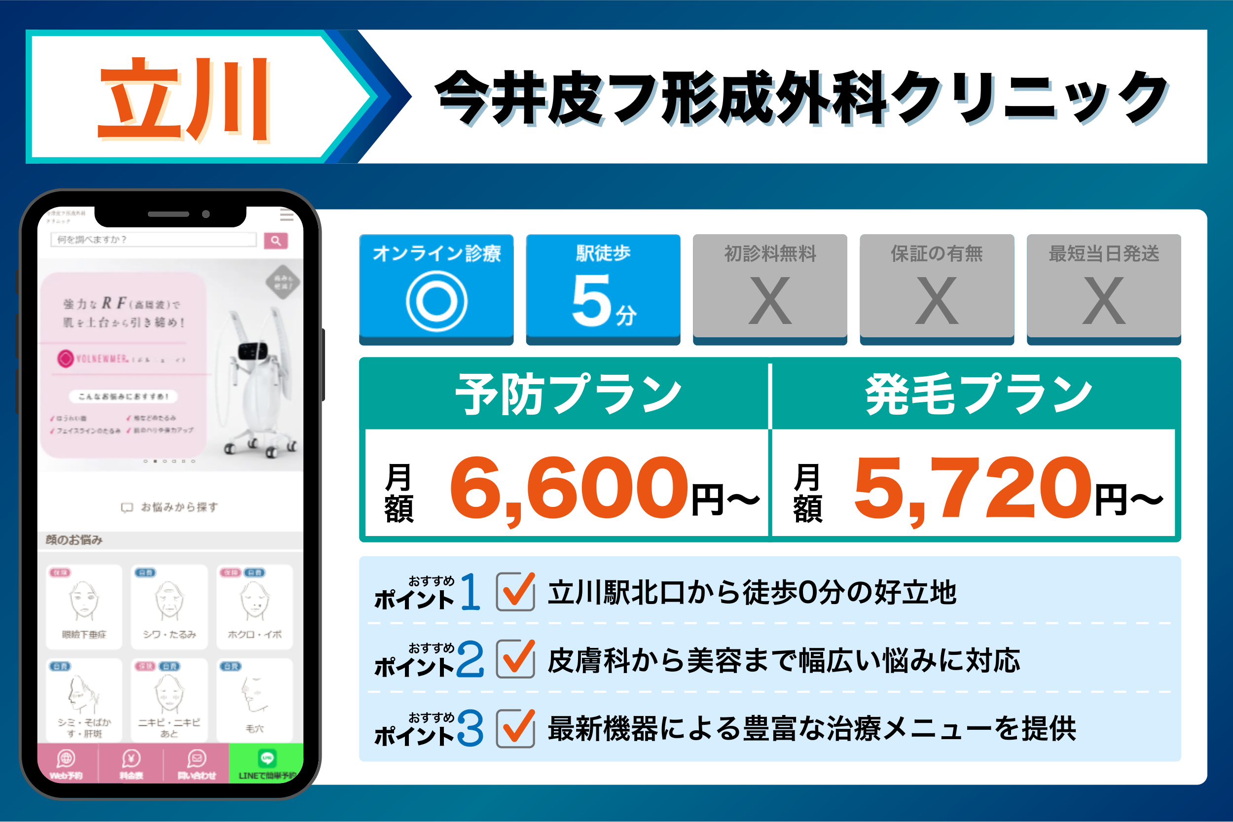 - 実際に通う利便性重視 → 立川駅徒歩圏内の今井皮フ形成外科クリニックや、立飛駅から近いしらたま皮膚科クリニックららぽーと立川立飛など、現地の駅近クリニック