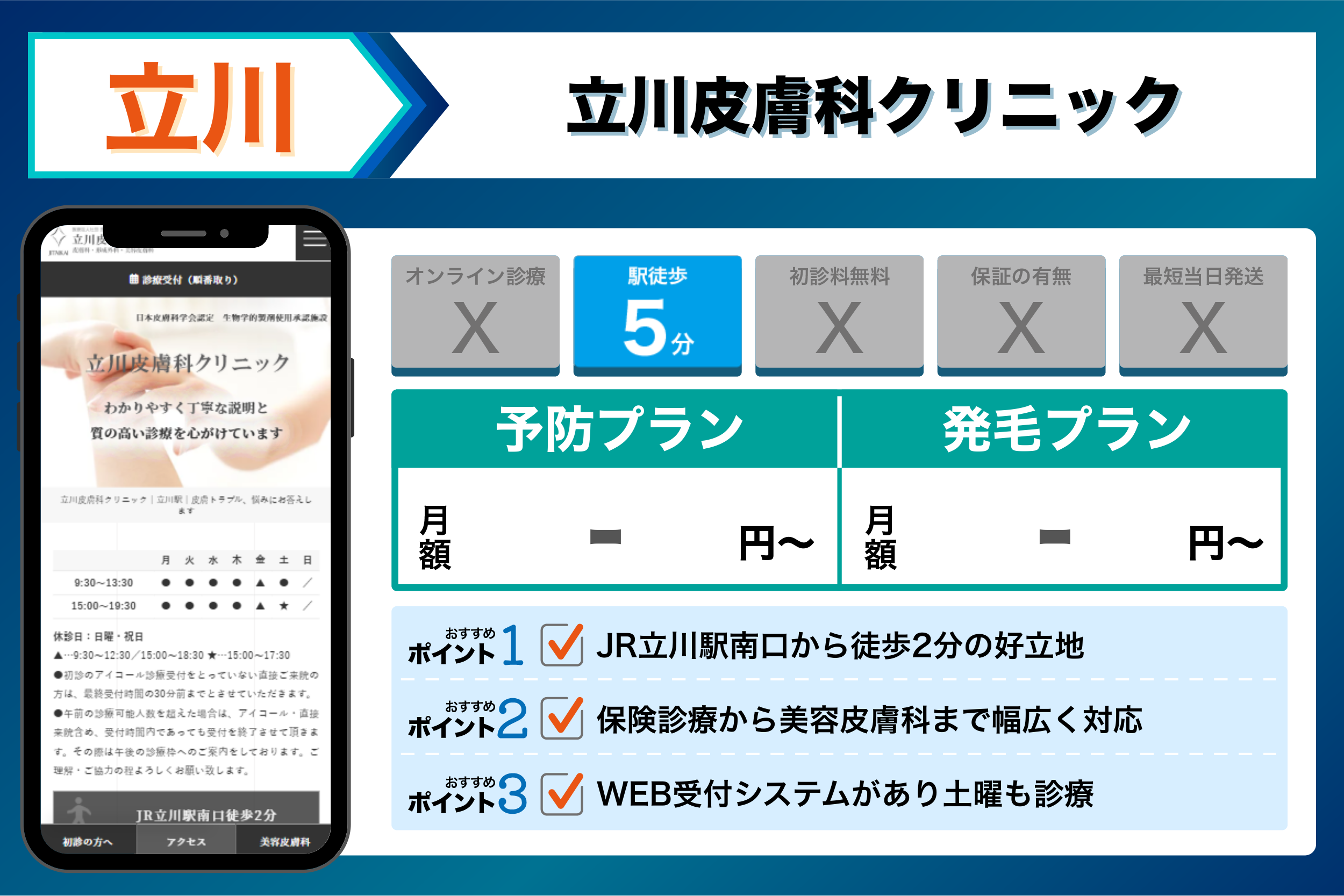 立川皮膚科クリニック | JR立川駅南口から徒歩2分の好立地 | 公式サイトに記載なし |