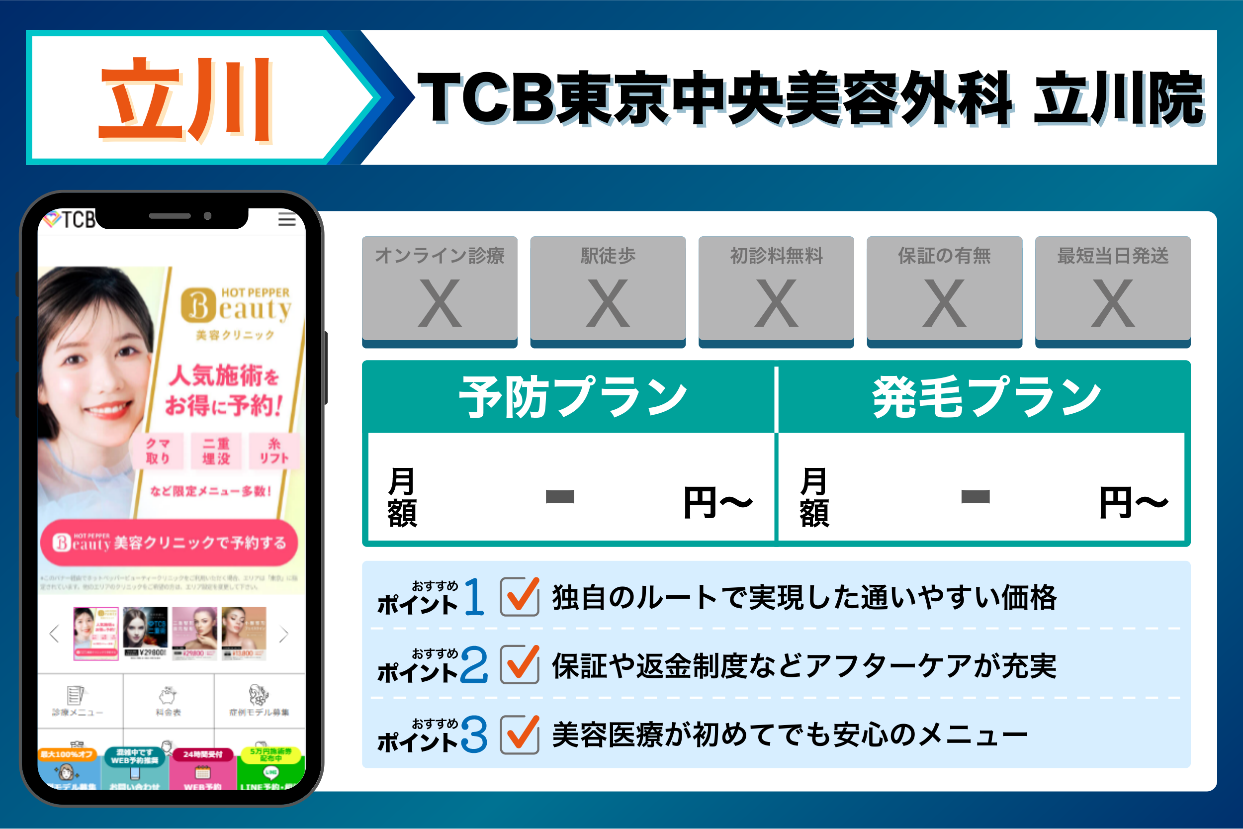 TCB東京中央美容外科 立川院 | 独自のルートで実現した通いやすい価格 | 公式サイトに記載なし |