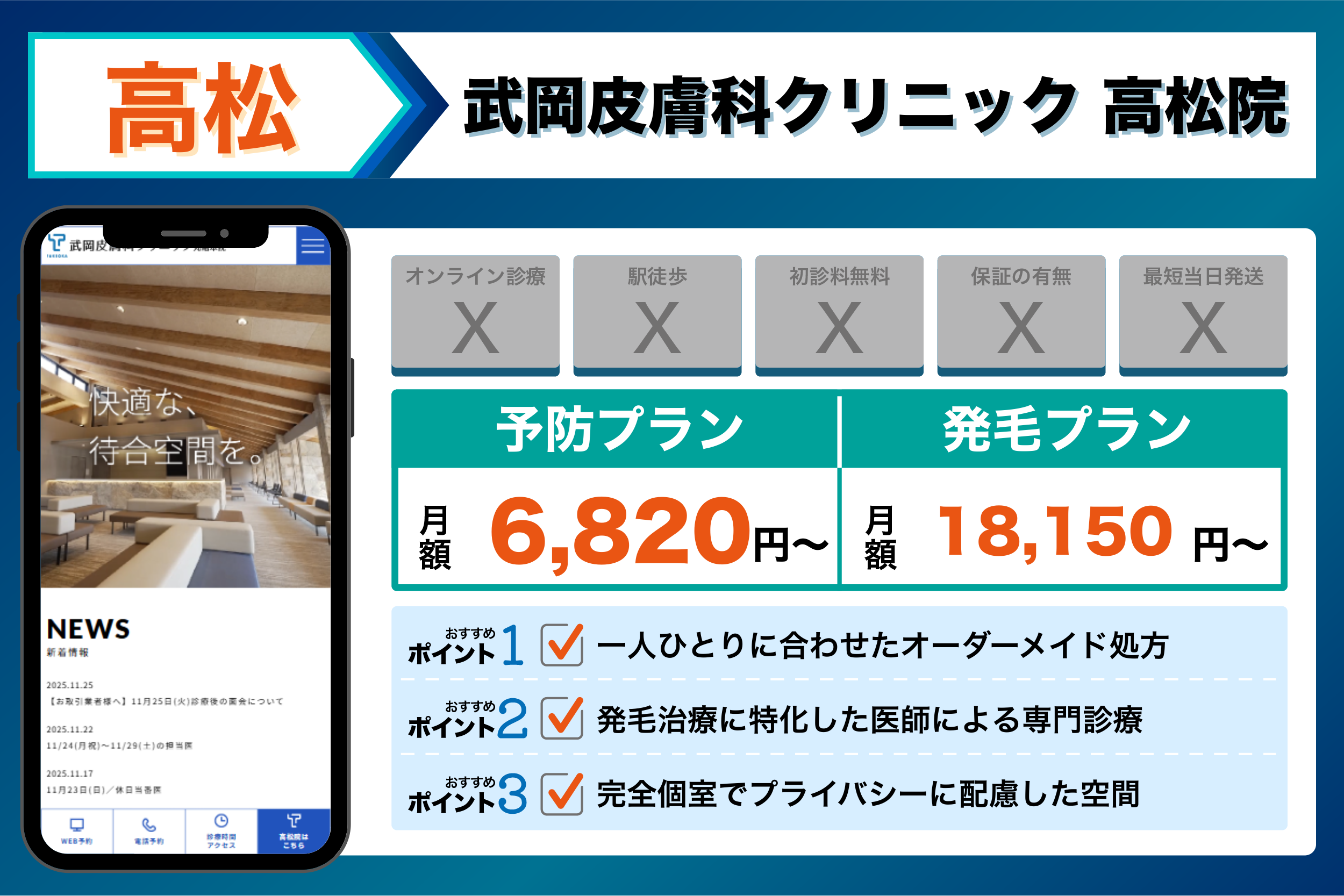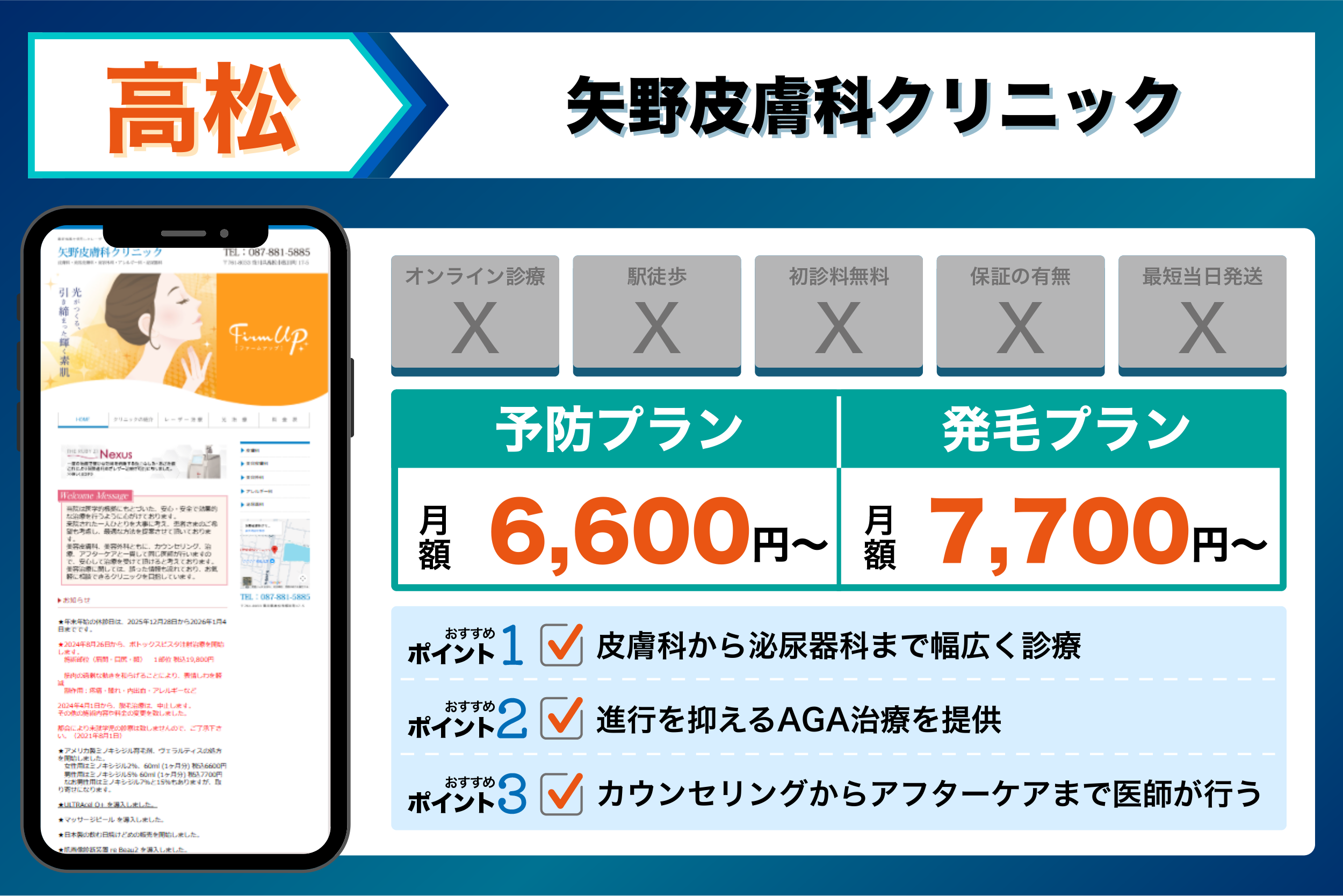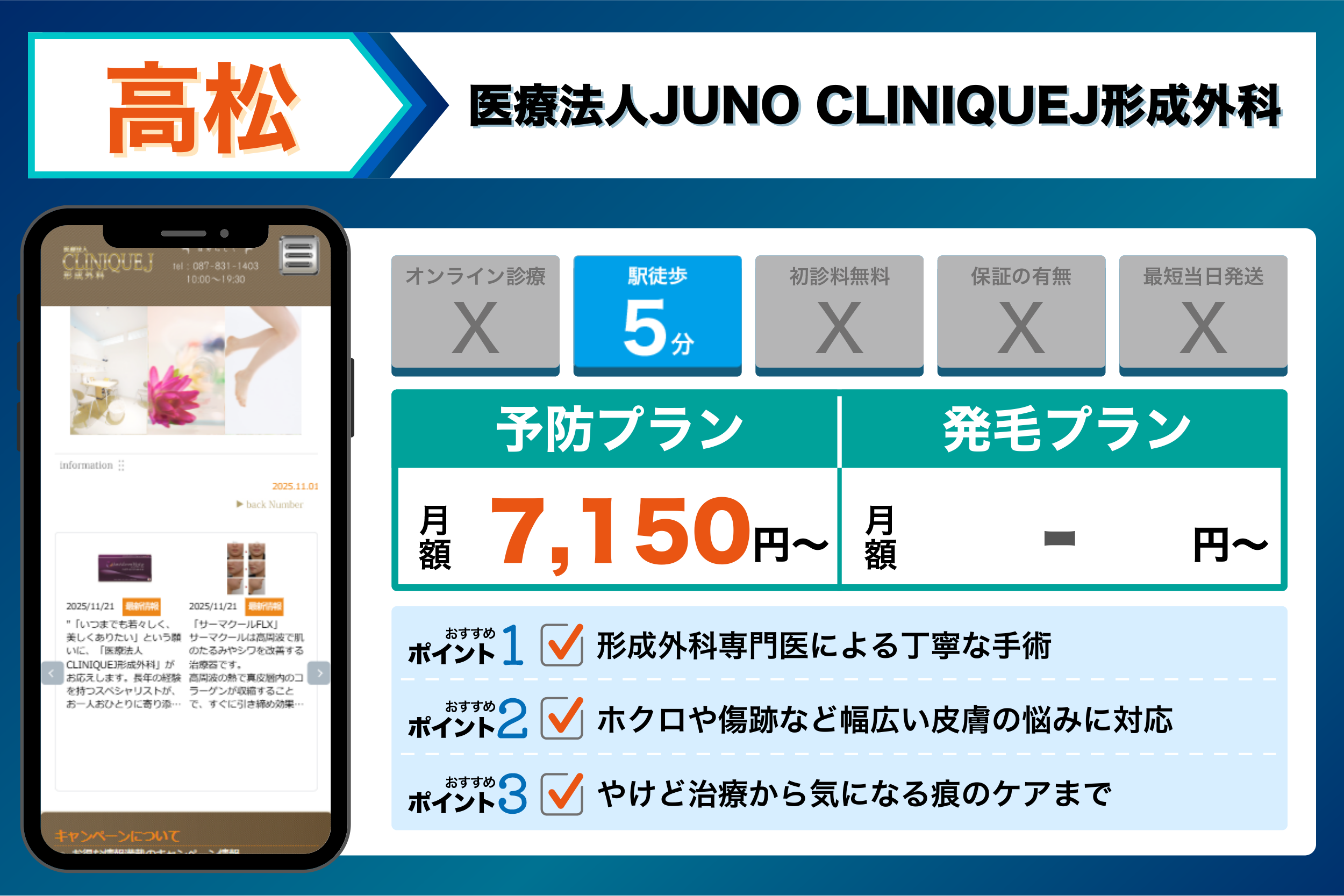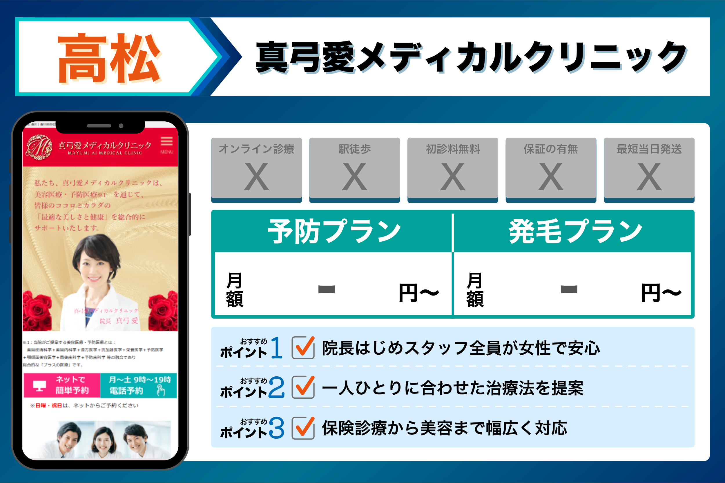 これらを踏まえて、4つの観点から選ぶ高松でおすすめのクリニックは以下のようになりました。