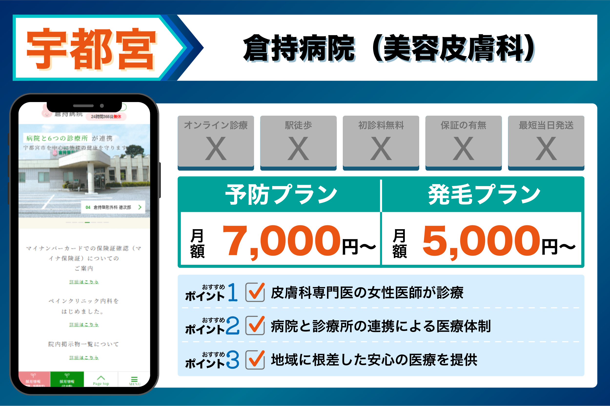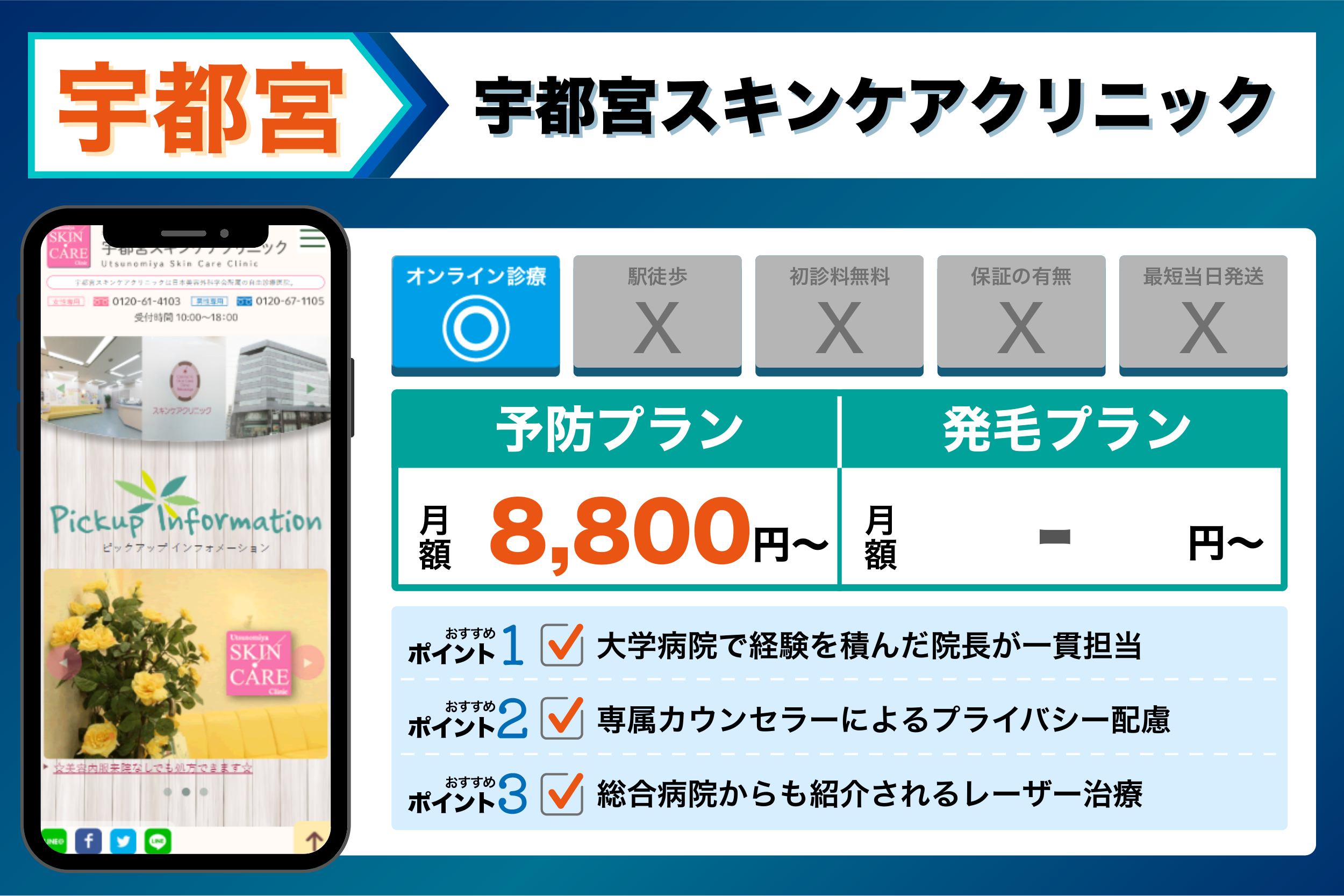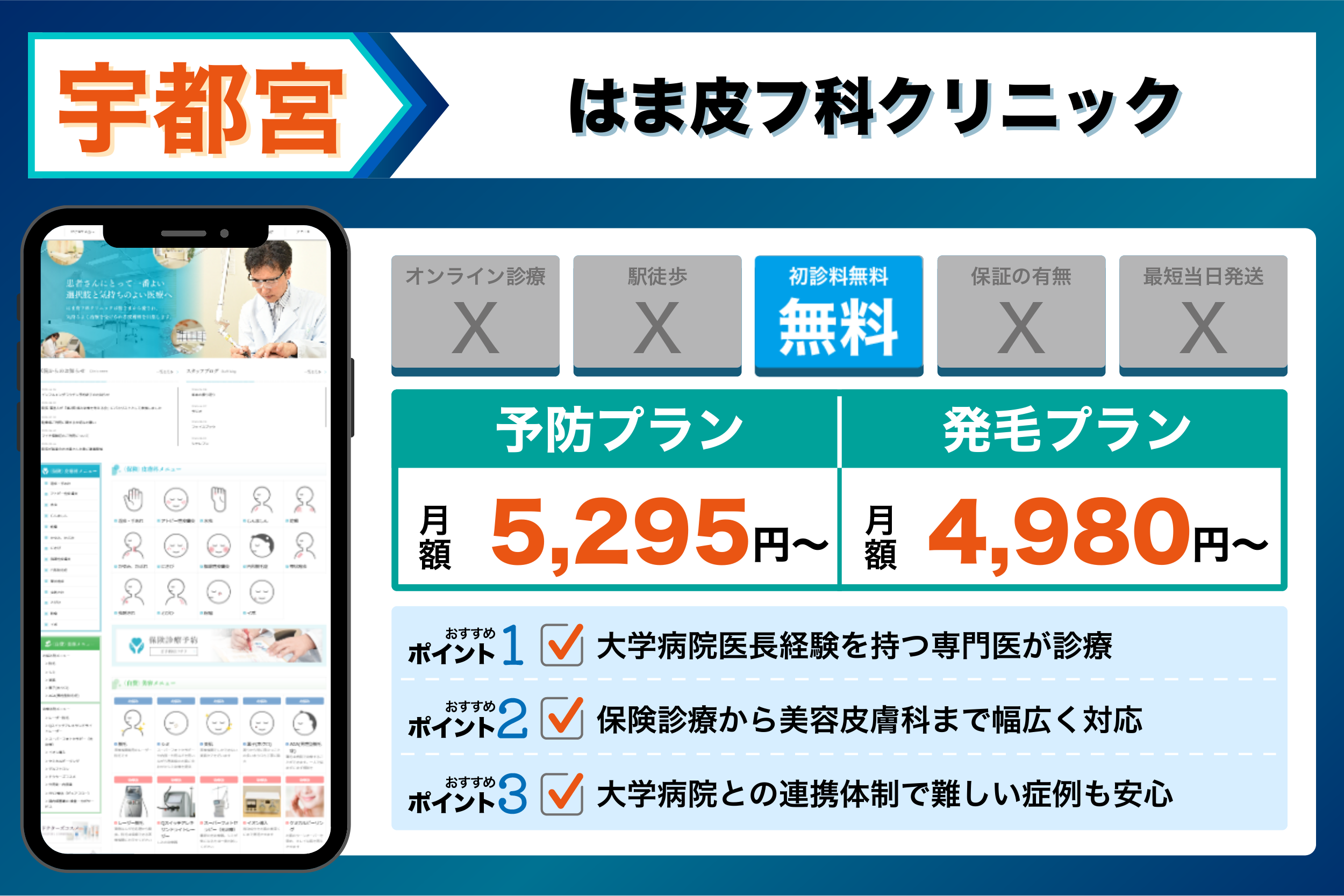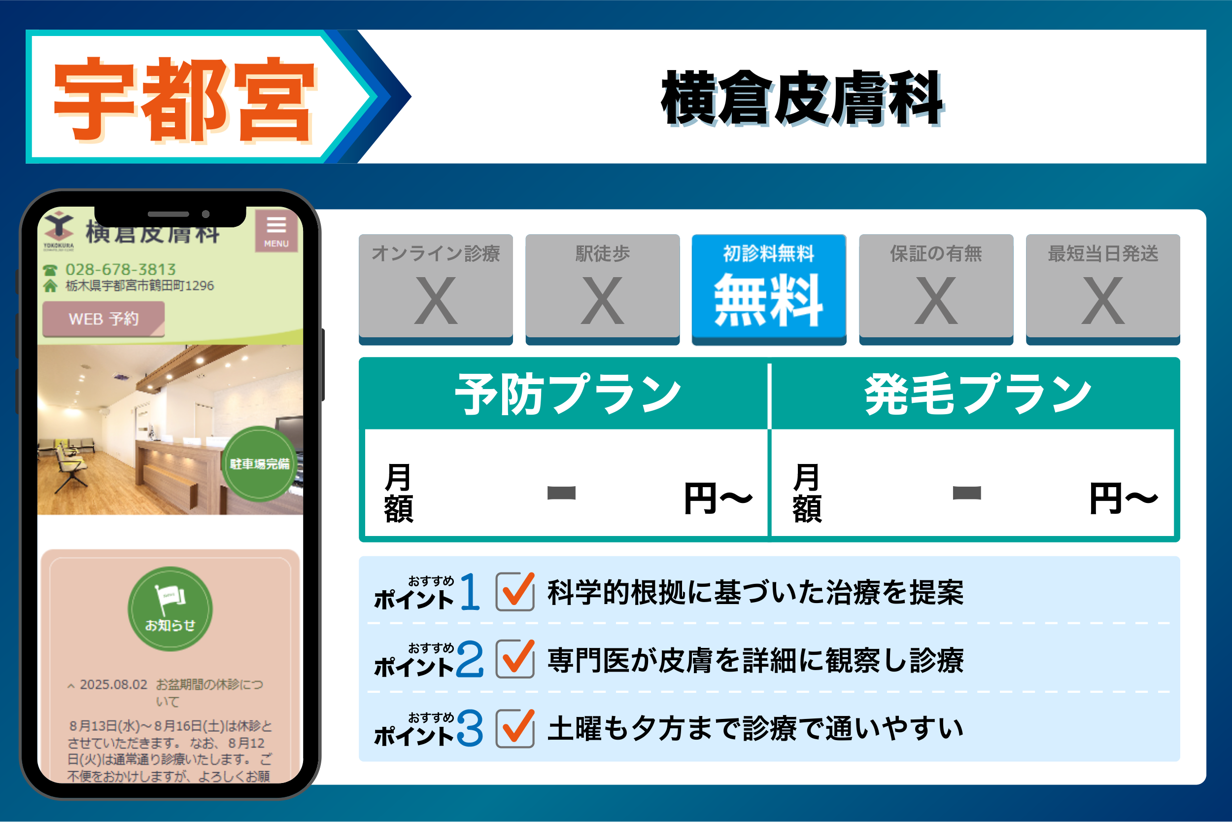 - 実際に通う利便性重視 → 宇都宮駅徒歩圏内の宇都宮竹内クリニックや、鶴田駅から近い横倉皮膚科など、現地の駅近クリニック