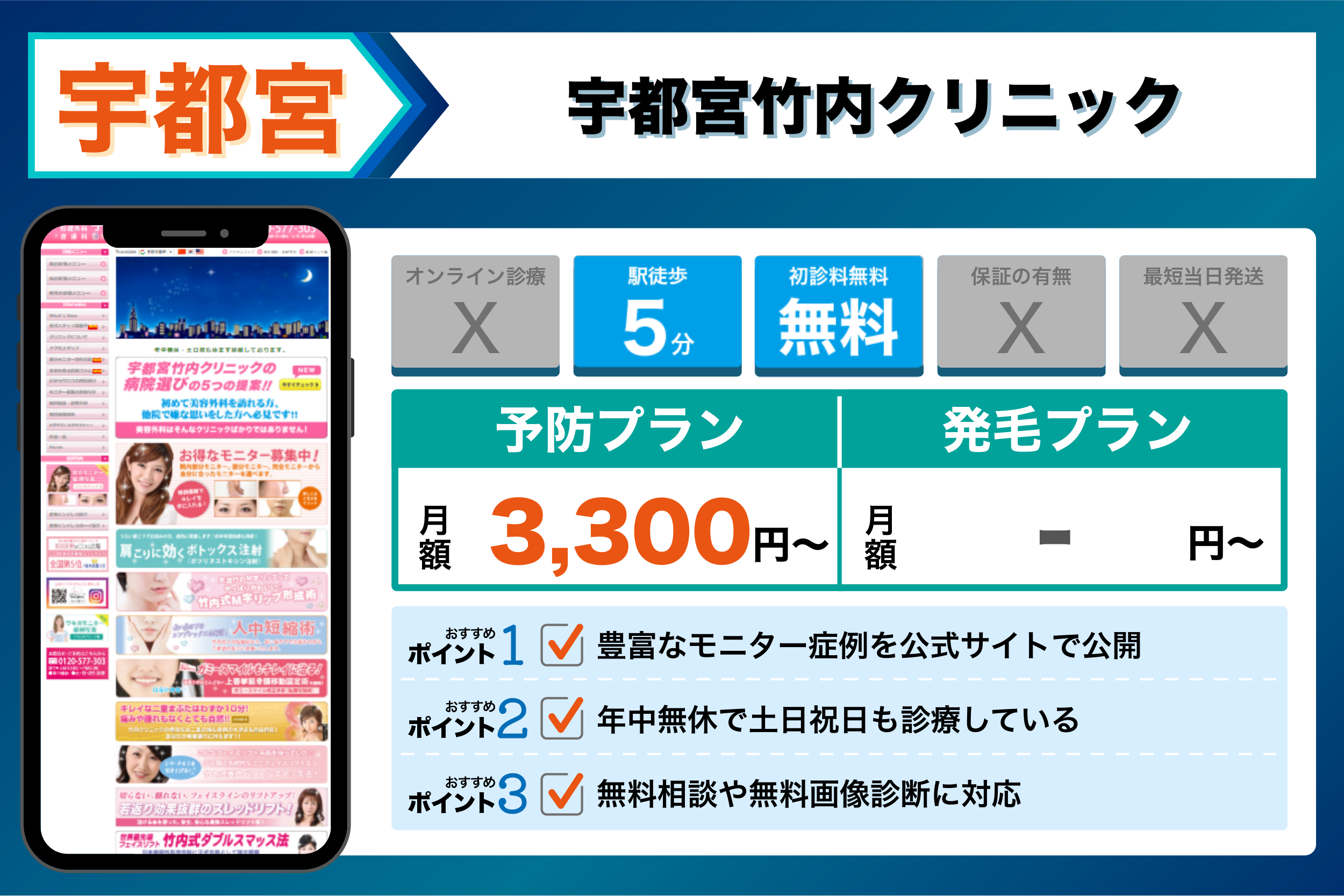 宇都宮竹内クリニック | 豊富なモニター症例を公式サイトで公開 | 【予防】:フィナステリド(ジェネリック):3,300円から |