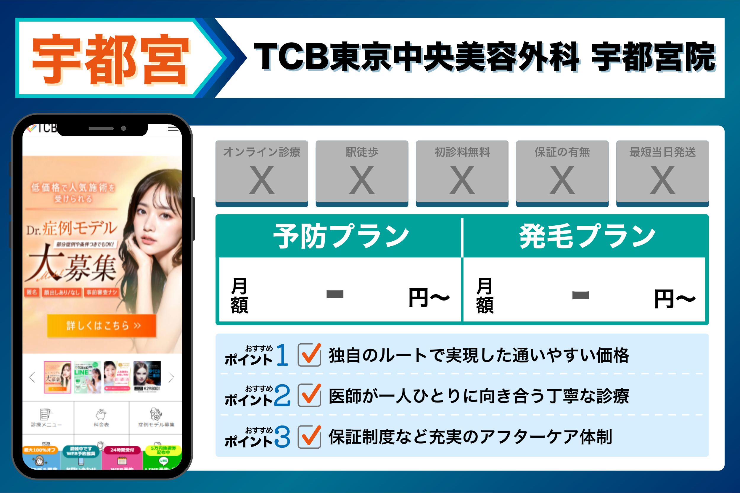 TCB東京中央美容外科 宇都宮院 | 独自のルートで実現した通いやすい価格 | 公式サイトに記載なし |