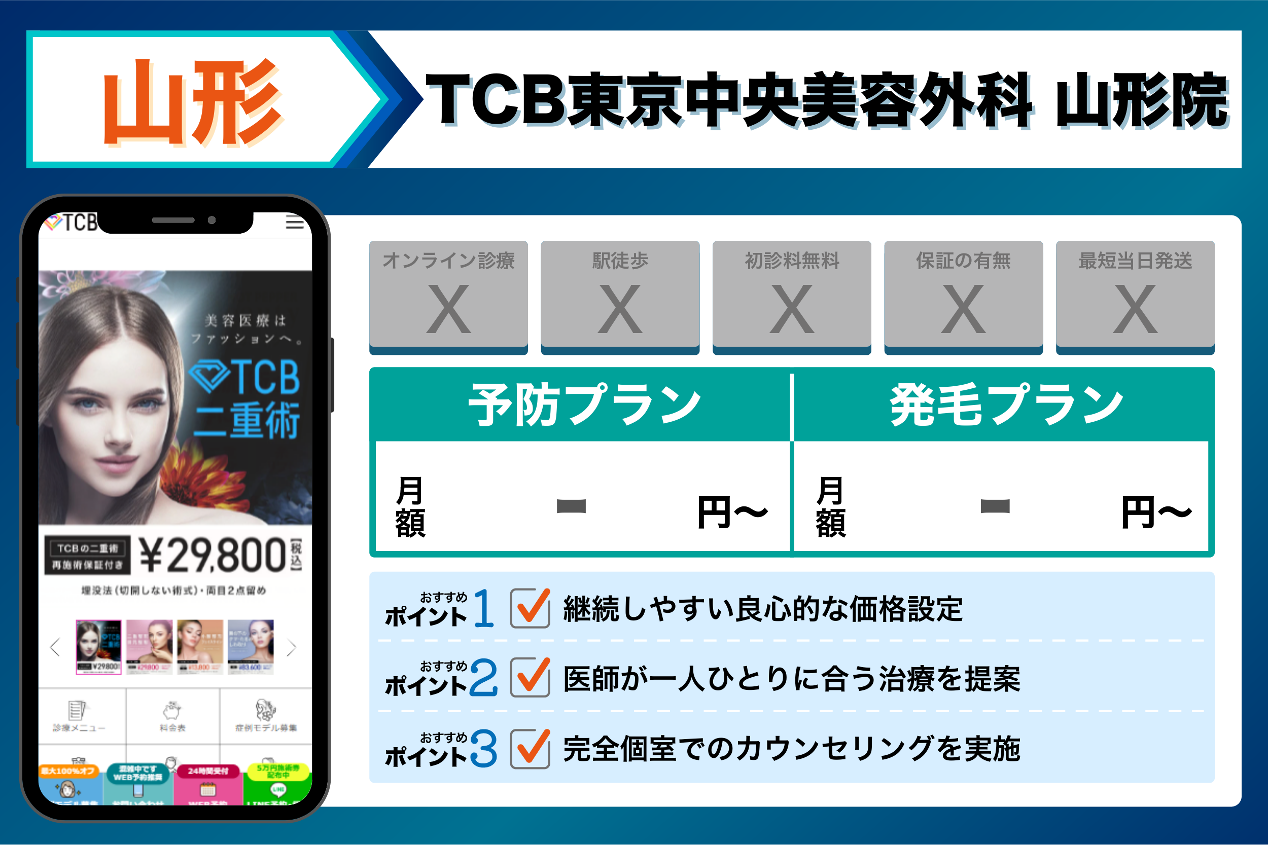 TCB東京中央美容外科 山形院 | 継続しやすい良心的な価格設定 | 公式サイトに記載なし |