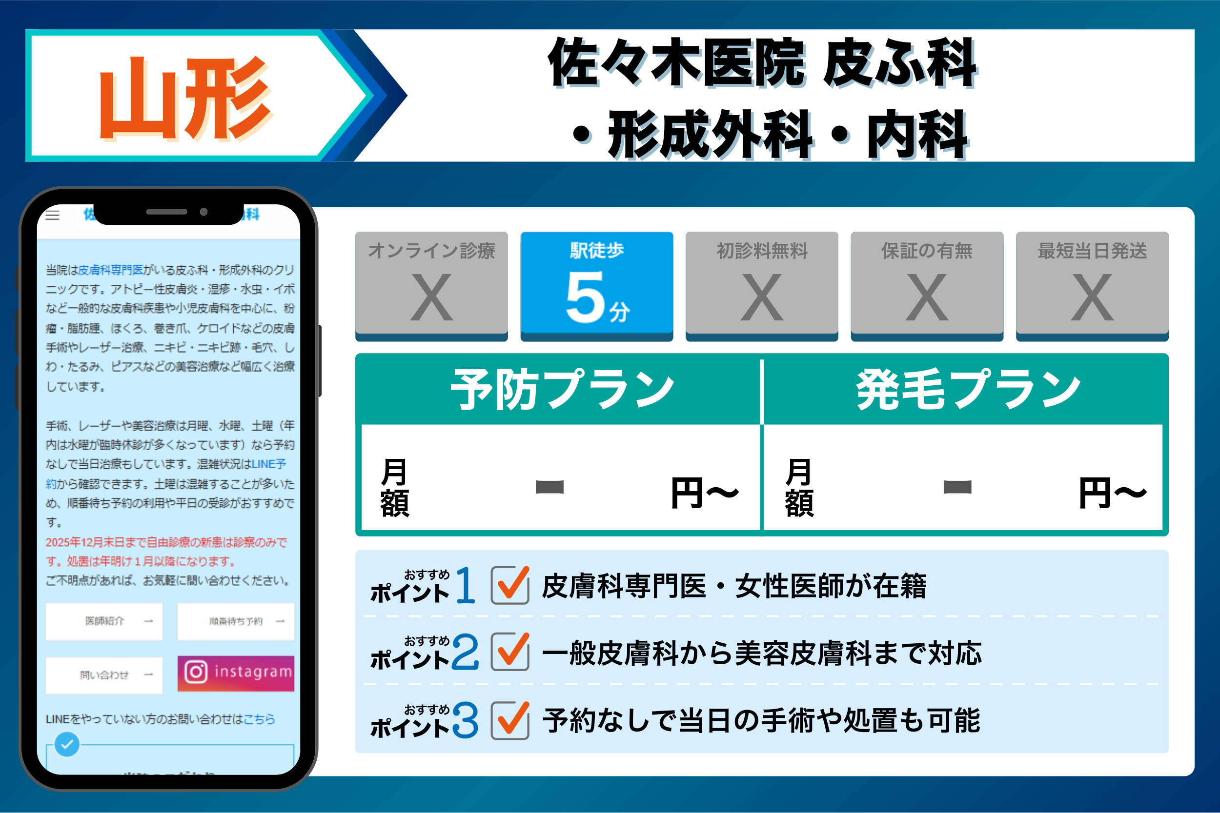- 実際に通う利便性重視 → 山形駅徒歩圏内のノースAGAクリニック山形院や、北山形駅から近い佐々木医院 皮ふ科・形成外科・内科など、現地の駅近クリニック