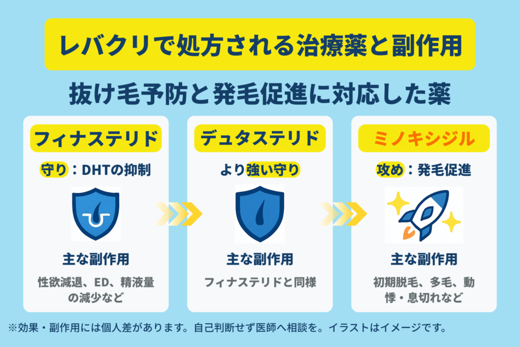 レバクリでは、AGA治療に必要な「守り(抜け毛予防)」と「攻め(発毛促進)」の両方に対応した薬が処方されます。代表的なのは フィナステリド・デュタステリド・ミノキシジル の3種類です。