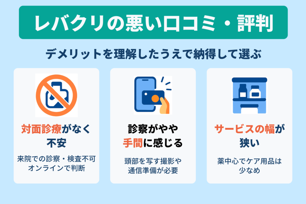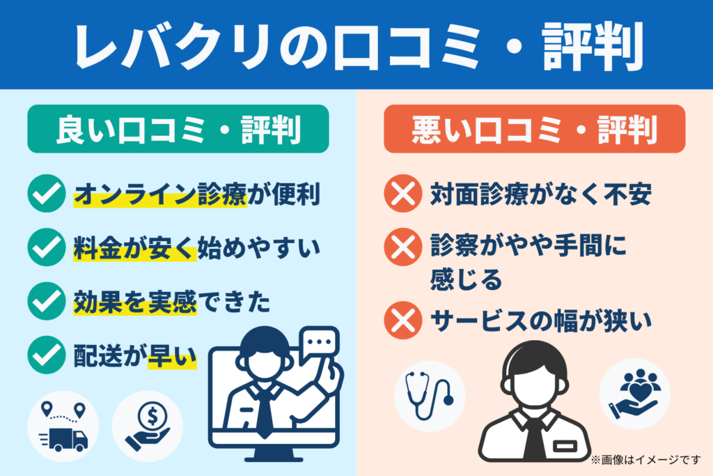 レバクリのAGA治療については、実際に利用した人から 「料金の安さ」「オンラインの手軽さ」 を評価する声が多く寄せられています。一方で「対面診療がない点」をデメリットと感じる人も一定数います。ここでは、良い口コミ・悪い口コミの両方を紹介し、全体の傾向をまとめました。