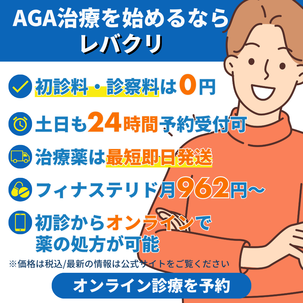レバクリは、自宅にいながらAGA(男性型脱毛症)治療が受けられる、オンライン診療専門のクリニックです。