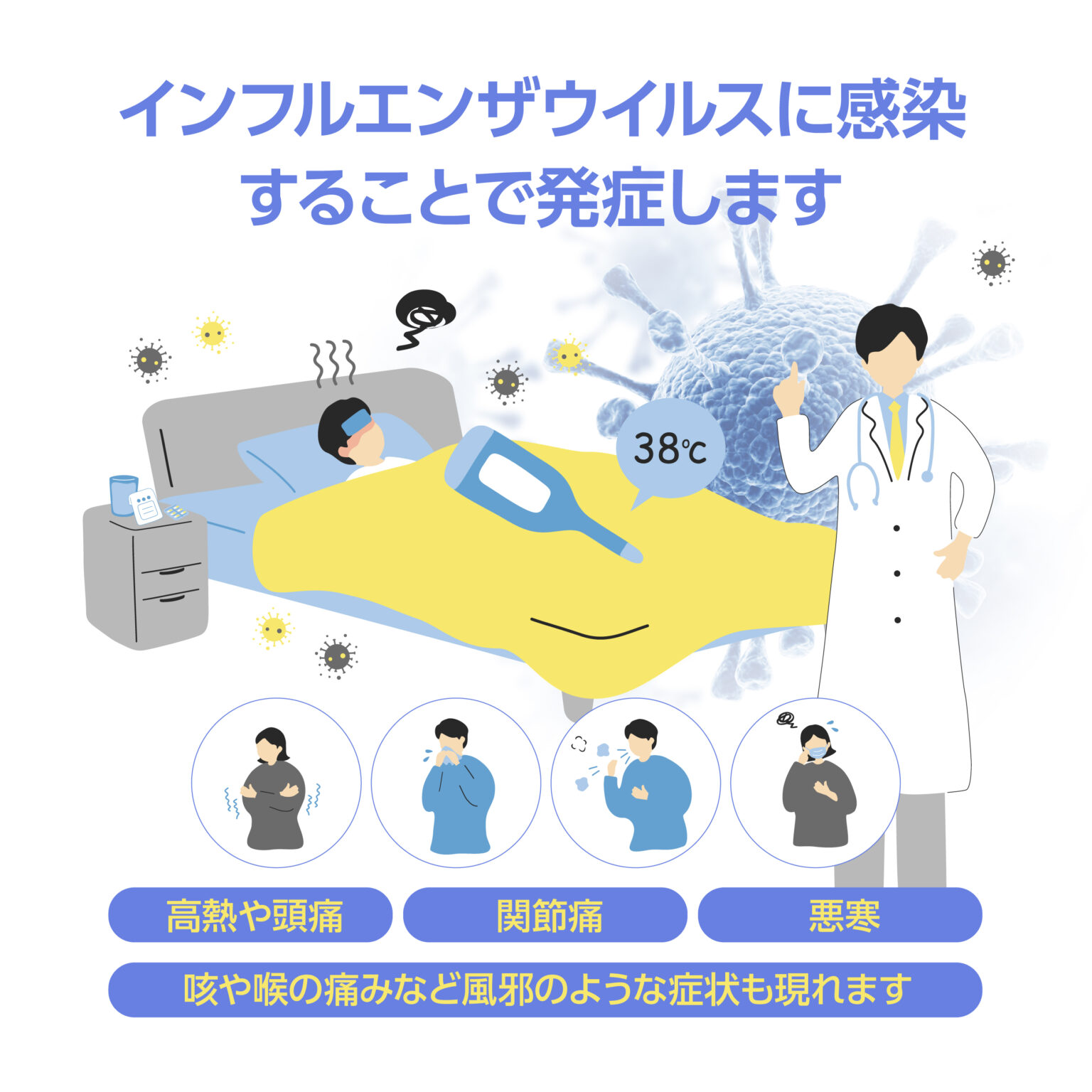 38度以上の高熱や頭痛、関節痛、悪寒などの症状に加え、咳や喉の痛みといった風邪のような症状が現れます。子供や高齢者、妊婦はインフルエンザにかかると、風邪に比べて重篤化する可能性が高くなります。