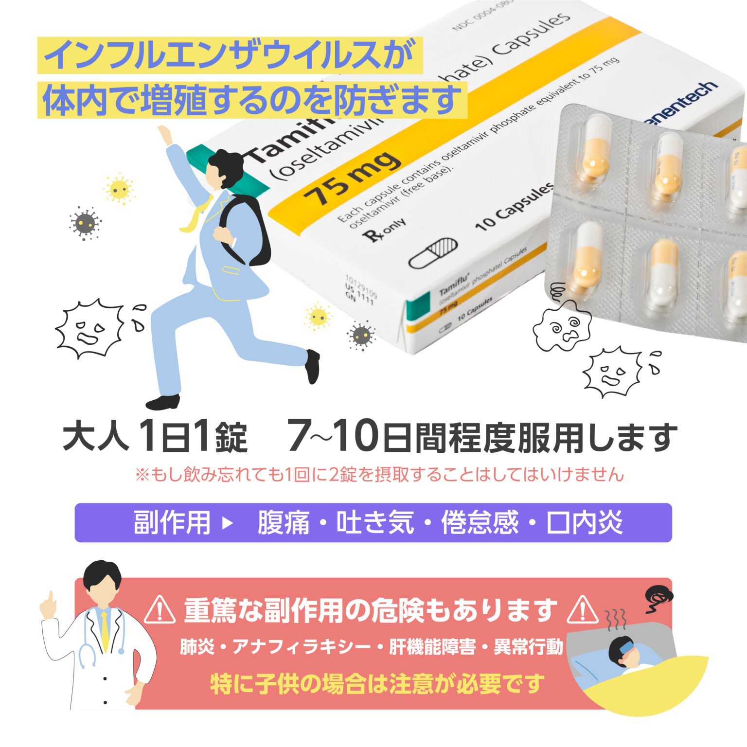 タミフルは認められている抗インフルエンザ薬の中で、唯一の経口内服薬です。大人は1日1回75mgのカプセルを服用することで、インフルエンザ予防の効果が得られます。期間は7〜10日分処方されることが多いです。また比較的価格が安く、取り扱っているクリニックが多いのも特徴です。