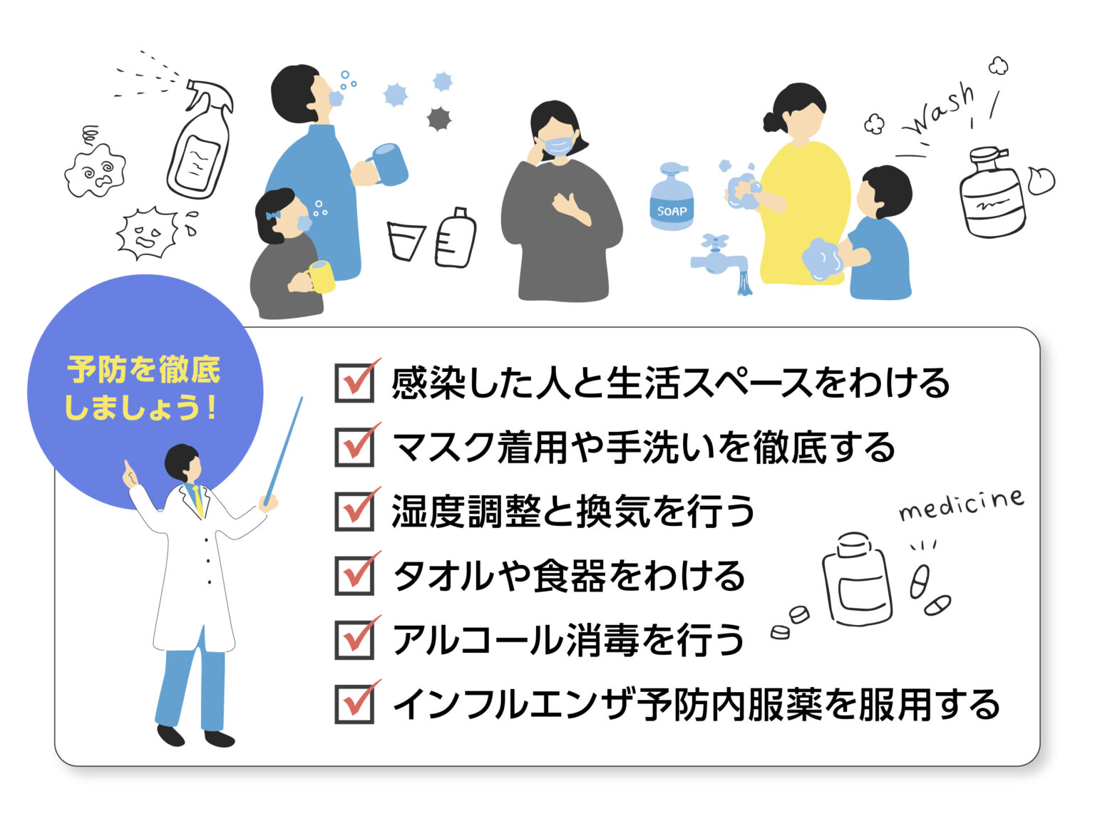 そのため、家族がインフルエンザに感染したことがわかったら、感染した人と生活スペースをわけるようにしましょう。別室で寝食をしてもらい、接触機会を減らすことが大切です。